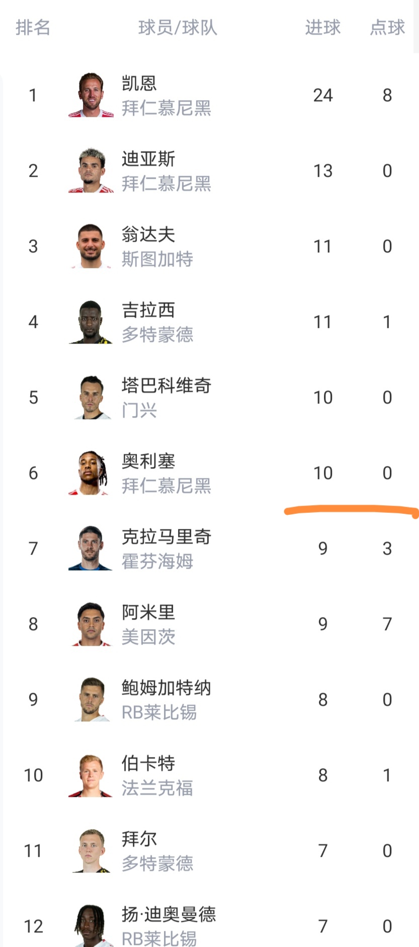 射手榜凯恩、吉拉西等6名球员进球上双。