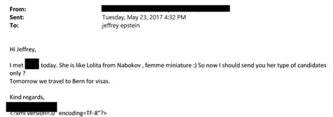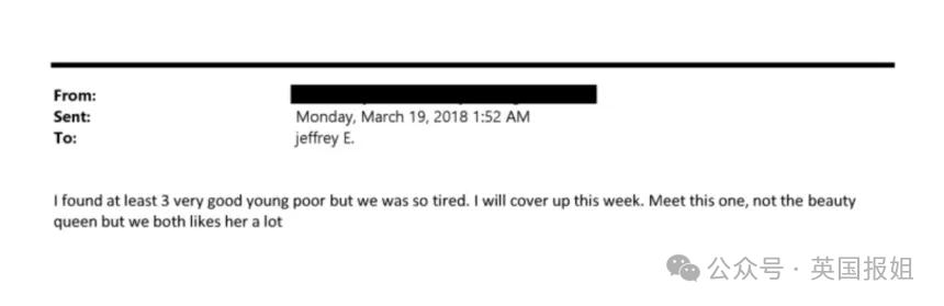此外,也有邮件明显能看出,有人在为爱泼斯坦物色女性,这些人的名字也都被涂掉了,显得很不合理: