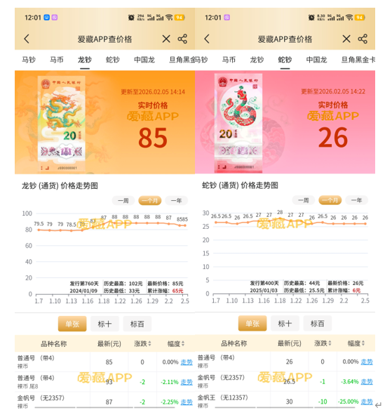 乱象之三:行情走势的“惊天反转”,普通投资者沦为接盘侠。短暂的爆炒过后,马年纪念钞行情迅速崩塌,短短十余天内,普通款回收价从峰值40元跌至18-20元区间,部分渠道甚至跌破面值,较峰值跌幅超50%。那些听信“抢到就是赚到”、借钱囤货的高位接盘者,如今陷入“卖不掉、亏不起”的两难境地——想抛售却鲜有人接盘,只能折价卖给币商,而币商的回收价已逼近面值。这种“高开低走”的走势并非个例:2024年龙年纪念钞发行初期被炒至300元,如今普通款价格仅80元左右,跌幅超67%;2025年蛇年纪念钞初期二手价38元,目前已回落至25元上下,跌幅32%。历史不断重演,却总有投机者在狂欢中迷失,最终为泡沫破裂付出代价。