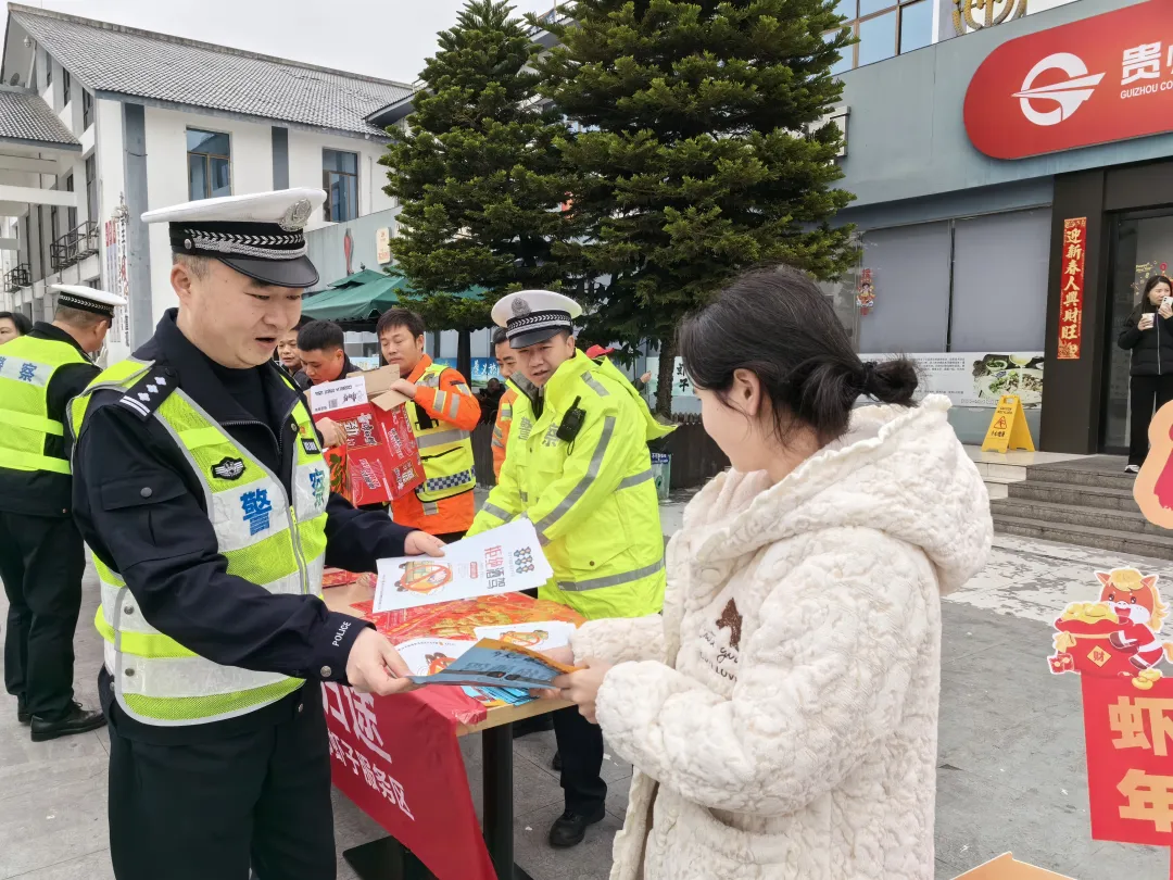为切实保障春运期间高速公路交通安全畅通,全力守护群众平安返乡,2026年2月11日,遵义市公安局交通管理支队高速二大队以“情满旅途·温暖回家路”为主题,联合辖区综合执法大队、业主方、养护等部门在杭瑞高速公路虾子服务区开展平安春运交通安全主题集中宣传活动。