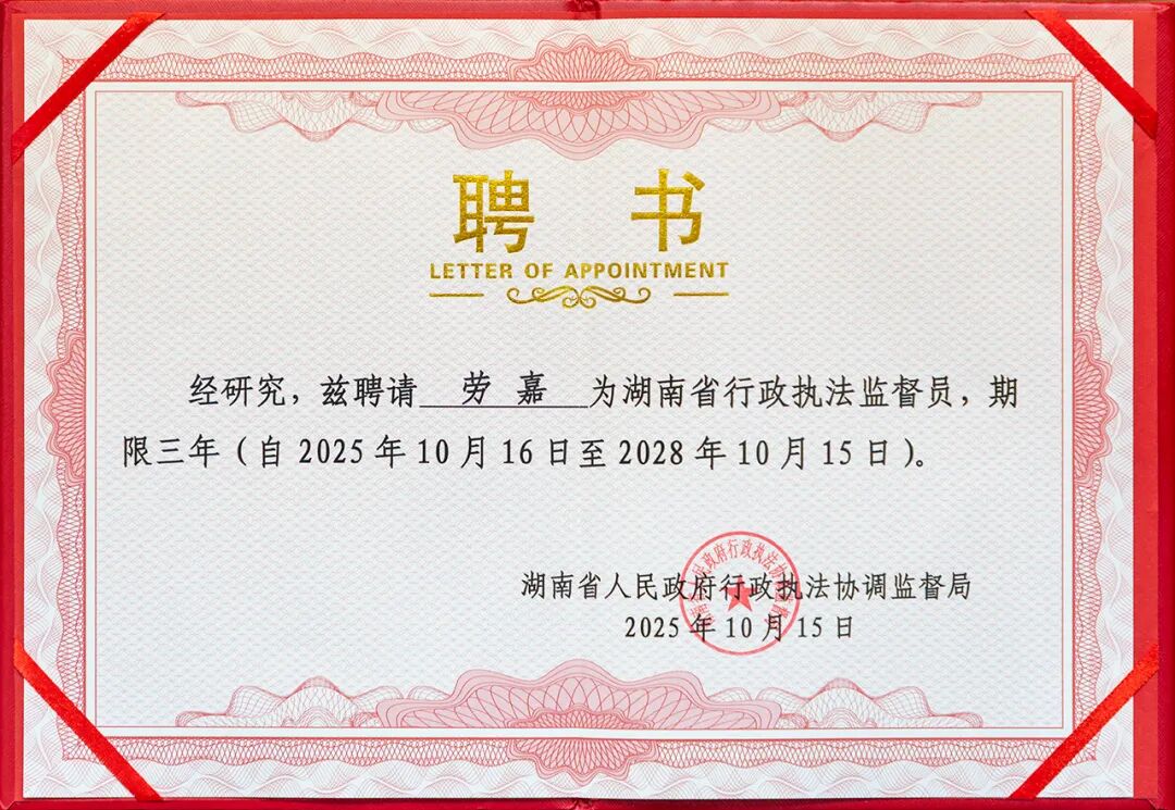 近日,湖南省人民政府行政执法协调监督局发布《关于选任行政执法监督员和设立行政执法监督联系点的通知》。为深入推进严格规范公正文明执法,充分发挥行政执法监督员和行政执法监督联系点对法治建设的推动作用,持续优化营商环境,经严格遴选,绿之韵集团总裁劳嘉获聘为"湖南省行政执法监督员"。