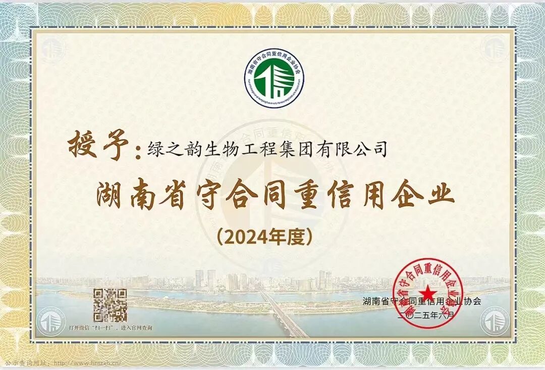 2025年6月,2024年度湖南省守合同重信用企业名单正式发布,新湖南、红网、三湘都市报等相继进行了公示报道。绿之韵集团连续第十七年蝉联“湖南省守合同重信用企业”与“长沙市守合同重信用企业”称号。这份跨越十七载的持续认可,有力印证了绿之韵将诚信视为企业生命线、融入发展血脉的长期坚守。