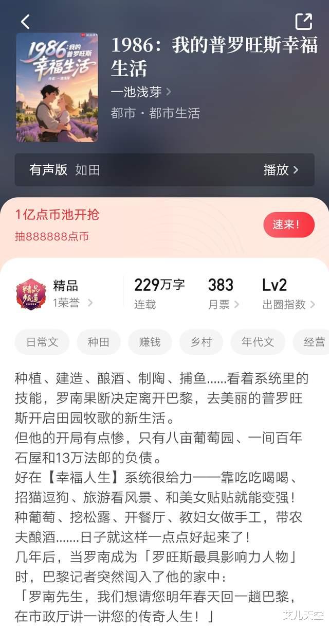 主角是法国华裔,重生到1986年开启了一个幸福人生系统,从拿下普罗旺斯的一个农舍开始了自己的种田幸福人生。