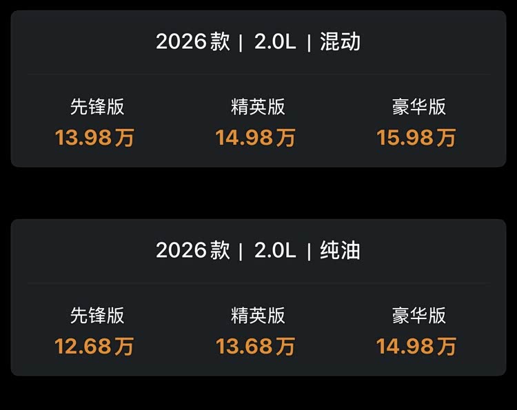 至于两个配置怎么选,我认为,买纯油的,你就选先锋版,每年用车里程大概率不多,主打便宜实惠。作为整个家庭的主要通勤工具,选双擎版更合适,而且尽量选精英版。因为你车 用得越频繁,这些配置的使用率就越高,你多花了这些钱就越值,说白了就是更容易用回本儿来。