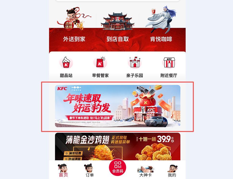 ①必要条件肯德基APP,选择“车速取”下单完成支付