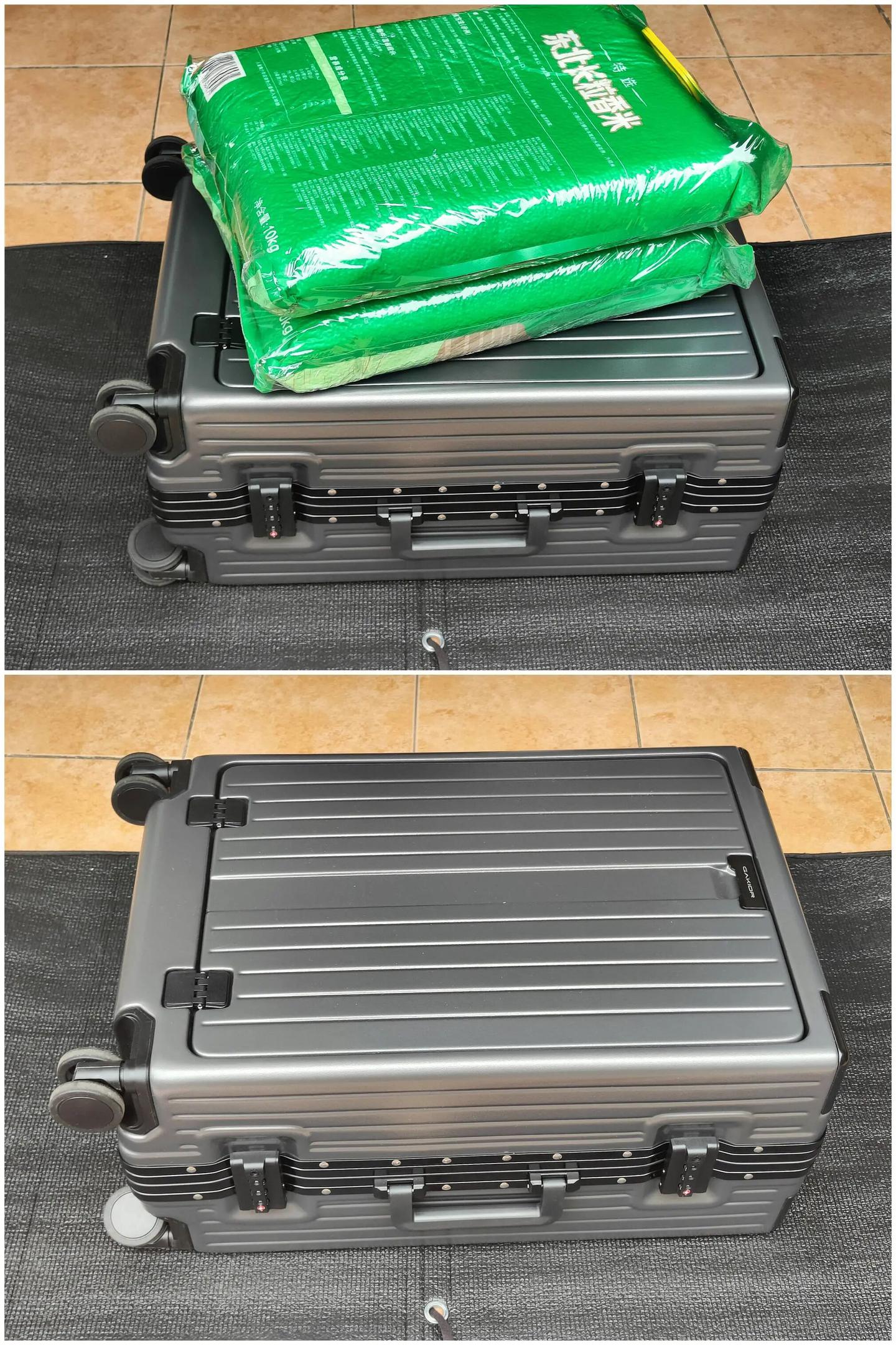 行李箱的 “6 防设计”,这也是我重点实测的部分。先说说防压防爆和硬核承重,我做了个小测试:把空箱平放在地上,在箱面中央位置叠上40斤的大米,静置了 1 个小时后掀开一看,箱体完全没有变形,中间部位也没有塌陷,铝框的贴合度还是一如既往地好。
