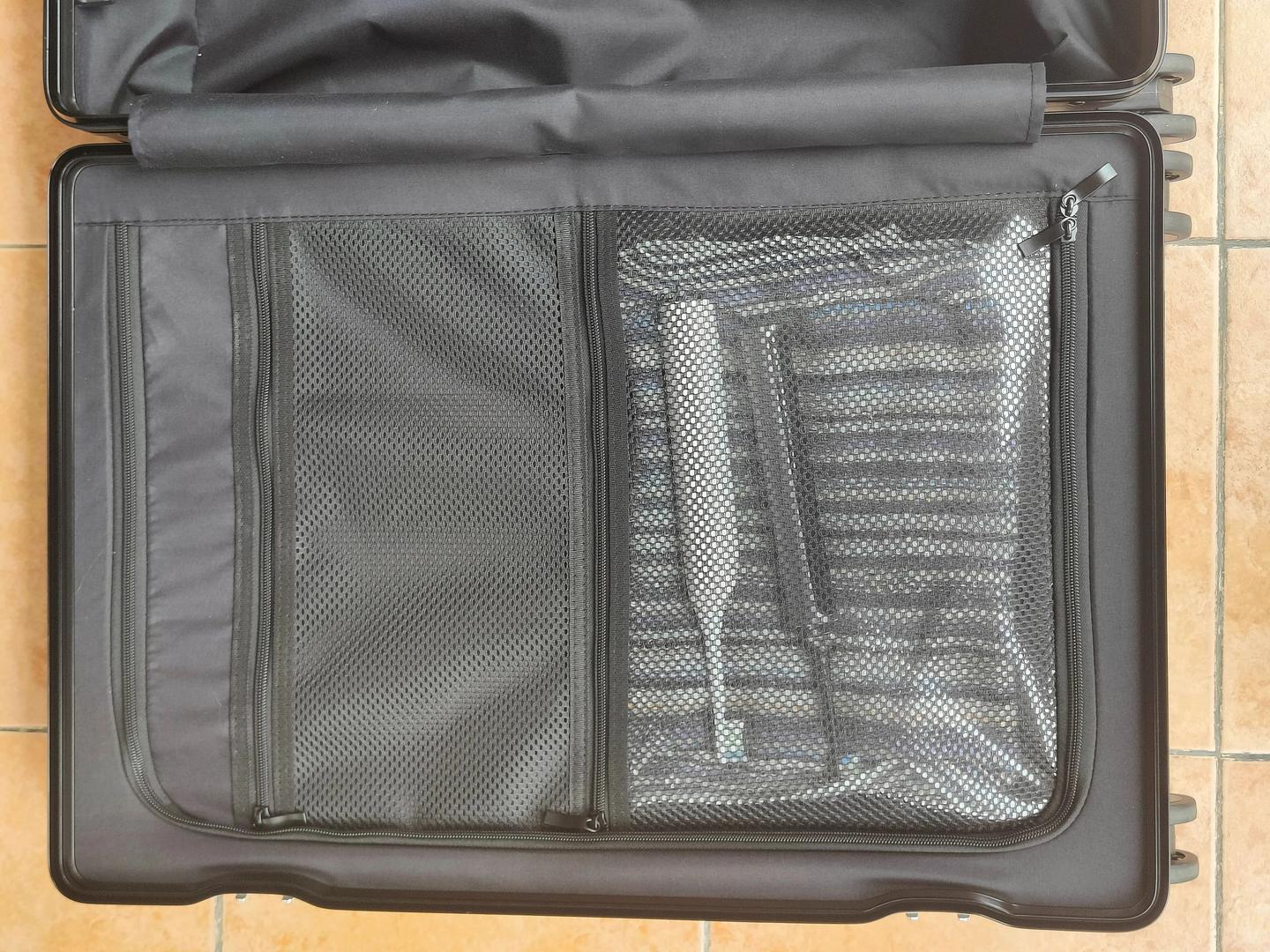 24 寸的箱子感觉比较适合平时中长途旅行或者全家的短途旅行,容量大概 65L,净重 5.5kg,不算沉,哪怕装满东西,我太太也能轻松拎上汽车后备箱。之前担心 24 寸装不下全家冬季冰雪游的装备,结果实测下来,厚外套、保暖衣物,再加上换贴身衣物和洗漱用品,通通都能装进去,空间利用率特别高。这全得益于它的合理设计:双层铝框没有占据太多内部空间,加上内里的分区规划,让每一寸地方都不浪费。