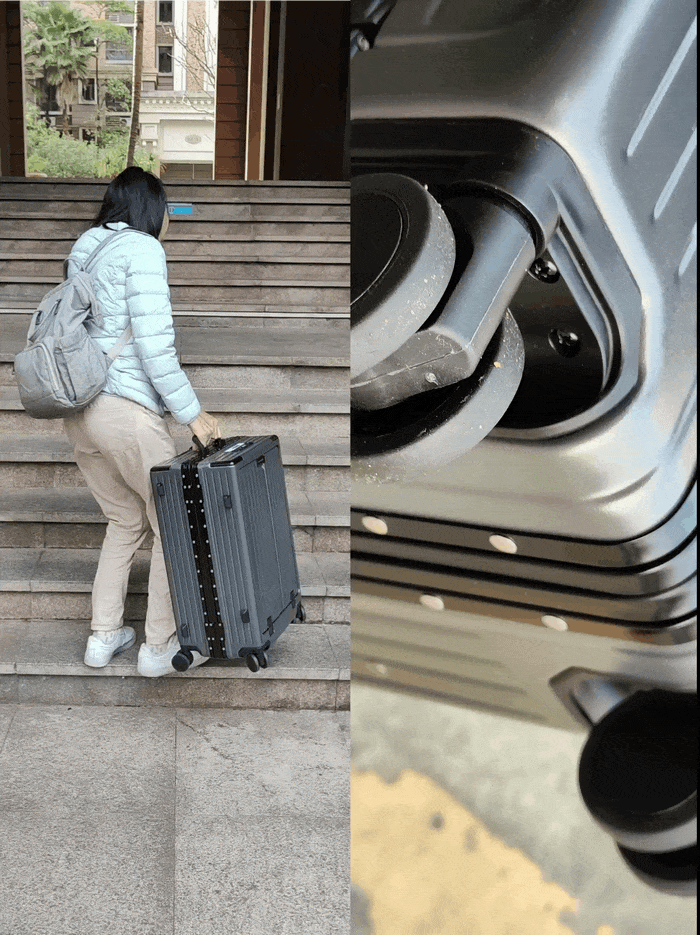 然后是轮子,这款箱子用的是双层高硬度 + 钢制轴承轻音万向轮,还带有减震橡胶,实测下来真的又顺滑又静音。我拉着它在水泥地、瓷砖地、机场传送带等不同地面上拖拉,轮子转动毫无阻力,360° 旋转特别灵活,无论是正面拖行还是侧面推行都很省力。
