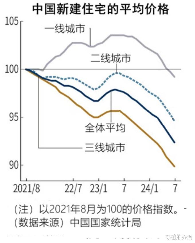国家统计局2024年8月15日的数据显示,70个大中城市的新建商品房价格平均比3年前的峰值下降8%。从2024年7月的数据来看,城市的规模越小,平均价格下降越明显。“三线城市”下降10%,省会级的“二线城市”下降5%。相比之下,北京、上海、广州和深圳的新房价格仅微弱下降。在2024年,1~7月新房销售面积比2021年同期减少50%,但相比之下 ,降价幅度则较小,原因是各地政府一直在努力减缓降价。