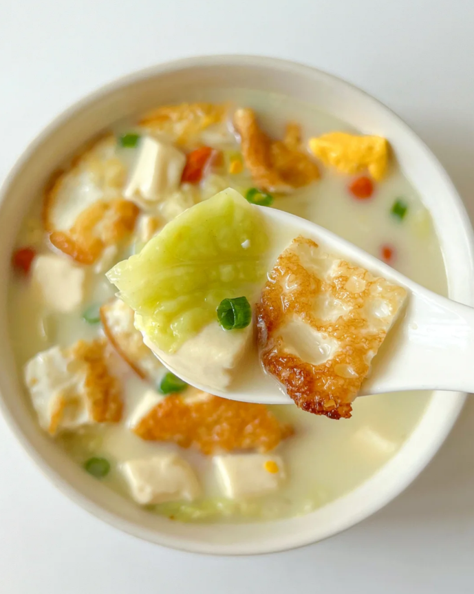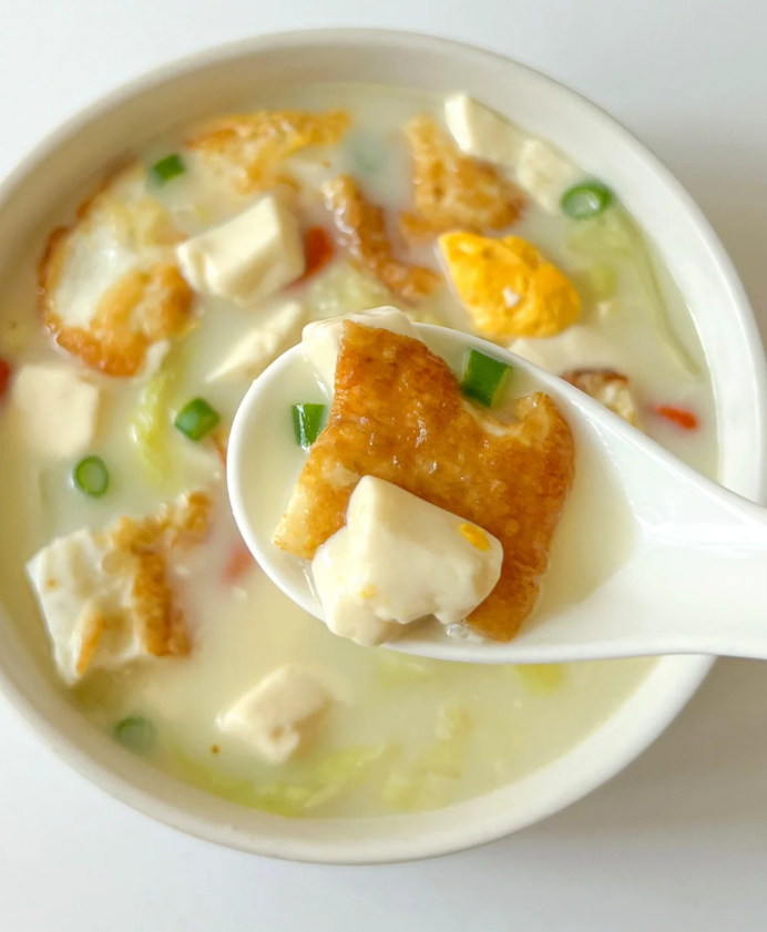 盛到白瓷碗里,先舀一勺汤吹凉了喝,鲜得眉毛都要飞起来!豆腐嫩得像云朵,轻轻一抿就化在嘴里;荷包蛋吸饱了汤汁,咬一口,流心蛋黄混着蛋香在舌尖爆开;白菜帮子炖得软乎乎,带着清甜的汁水。我家娃每次都捧着碗“吨吨吨”喝个底朝天,还举着空碗喊:“妈妈,明天还煮这个‘黄金汤’好不好?”其实这碗汤哪有什么复杂技巧,不过是把最简单的食材用最笨的方法煮在一起。就像奶奶说的:“做菜和过日子一样,不用急不用慌,火候到了,味道自然就出来了。” 寒冷的日子里,与其点外卖等半小时,不如花10分钟煮碗热汤,看着家人捧着碗暖手的样子,你会发现:幸福啊,有时候就是这么一碗冒着热气的白菜豆腐汤。