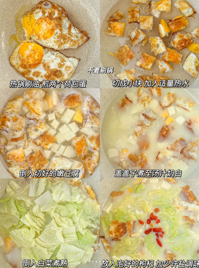 先给食材来个“自我介绍”:嫩豆腐得选那种颤巍巍的水豆腐,用手一碰就晃悠悠,切的时候得像捧小猫似的轻手轻脚;白菜要挑黄心的,叶子嫩得能掐出水,帮儿也得留着,煮软了比肉还香;鸡蛋嘛,土鸡蛋最好,煎出来的荷包蛋边缘会带着琥珀色的焦脆,那是味精都换不来的鲜甜。哦对了,秘密武器是一小把枸杞,泡在温水里像红宝石似的,最后撒进汤里,颜值和营养立刻翻倍!第一步煎荷包蛋是灵魂,记住三个“不”:油不用多,刷薄薄一层就行;火不用大,中小火慢慢煎才不会糊;蛋不用急着翻,等蛋白边缘起了金黄的裙边,用铲子轻轻推一下能滑动,再翻面煎10秒,保证蛋黄半流心——这可是奶奶传下来的“糖心蛋秘诀”!煎好的荷包蛋切成菱形块,别急着刷锅!锅底那些金黄的蛋渣可是“天然味精”,待会儿煮汤全靠它们提鲜呢。