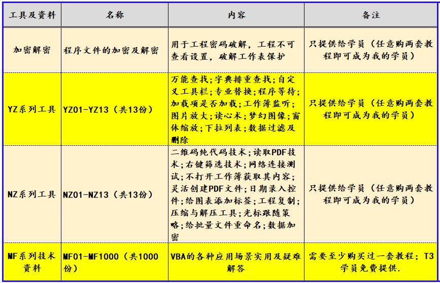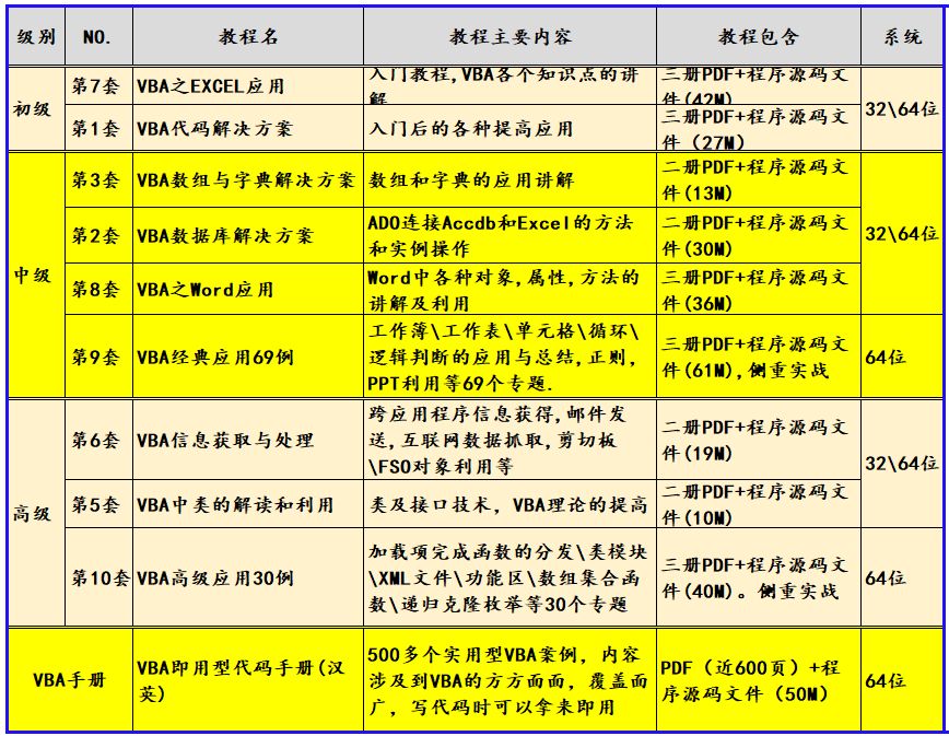 我给VBA的定义:VBA是个人小型自动化处理的有效工具。利用好了,可以大大提高自己的工作效率,而且可以提高数据的准确度。“VBA语言専攻”提供的教程一共九套,分为初级、中级、高级三大部分,教程是对VBA的系统讲解,从简单的入门、到入门后的提高、到数据库、到字典、到Word VBA的应用、到高级网抓及类的应用、一直讲到程序的分发。另外,为了方便大家在写代码是方便查找,“VBA语言専攻”又推出了一部VBA汉英手册,这部手册覆盖了VBA的方方面面,与实际工作衔接度高。为了更好的完善学员的知识结构,丰富学员的实践经验,“VBA语言専攻”还提供给学员VBA工具,有较复杂些的NZ系列工具,较容易些的YZ系列,这个两个工具系列一共是二十六份。