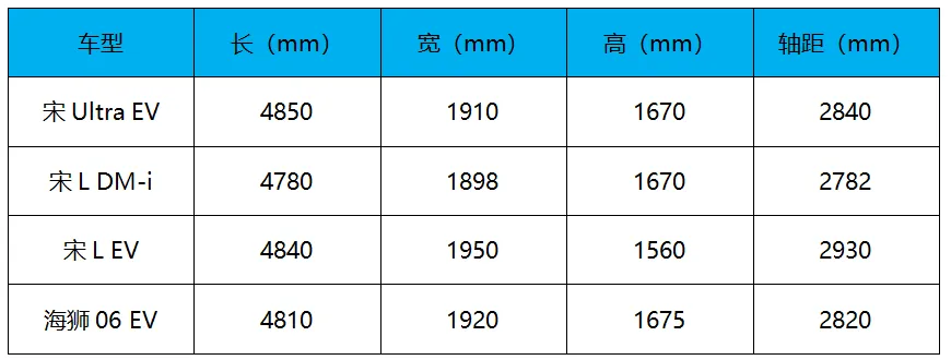 尺寸方面,宋Ultra EV的车身长宽高为4850/1910/1670mm,轴距2840mm。宋Ultra EV的尺寸比宋L DM-i要大,跟宋L EV相比,它车身更长高度更高,但轴距会明显短一些,与它尺寸最为接近的就是海狮06 EV了。所以这时候大家应该明白这宋Ultra EV是一个什么样的定位了吧?它是宋L DM-i的纯电版本,与海狮06 EV是同一个底子。