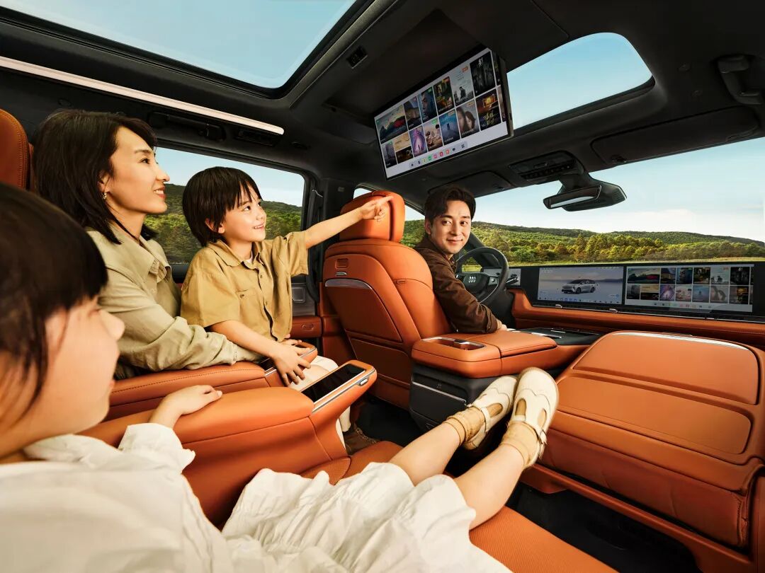 车内10.25英寸仪表屏、 16.3英寸中控屏和16.3英寸的副驾屏,还有21英寸的4K后舱屏幕,均获莱茵 TÜV 护眼认证,过滤有害光,孩子安心观看。除此之外整套系统还搭载了高通 SA8775P 芯片,拥有72TOPS算力,AI 语音助手融合三大模型,支持 700 余种指令,聊天、绘画、搜资讯无所不能……
