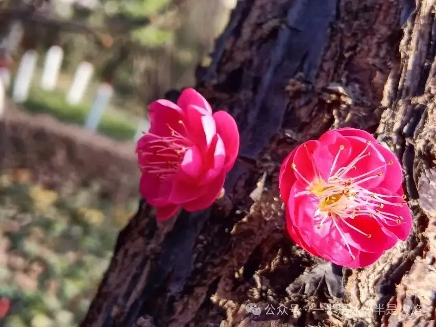 白梅正盛,红梅疏落。