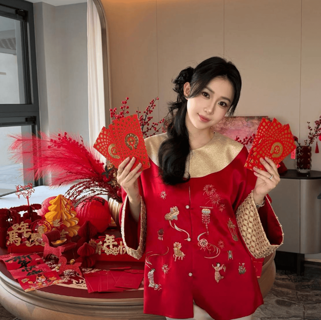从宣云晒出的照片来看,她与潘玮柏在上海豪宅欢度春节。照片中,宣云身着一套红色中式套装,既充满节日氛围,又不失雅致大方。虽是宽松的版型,但依然很好地展现了她优美的肩颈线条和修长的手臂。作为母亲的她身形依旧纤细高挑,比例匀称,举手投足间流露出优雅与从容,容貌与气质丝毫不逊色于女明星。