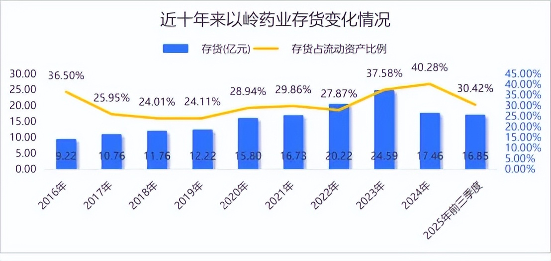 截至2025年9月30日,以岭药业存货余额为16.85亿元,虽较期初的17.46亿元略有下降,但存货规模占流动资产合计的比例也达到30.42%。