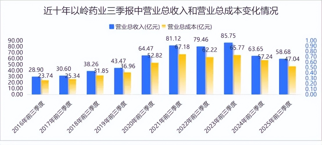 2025年前三季度,以岭药业营业收入为58.68亿元,仍然同比下降7.82%,继续延续着下滑态势。
