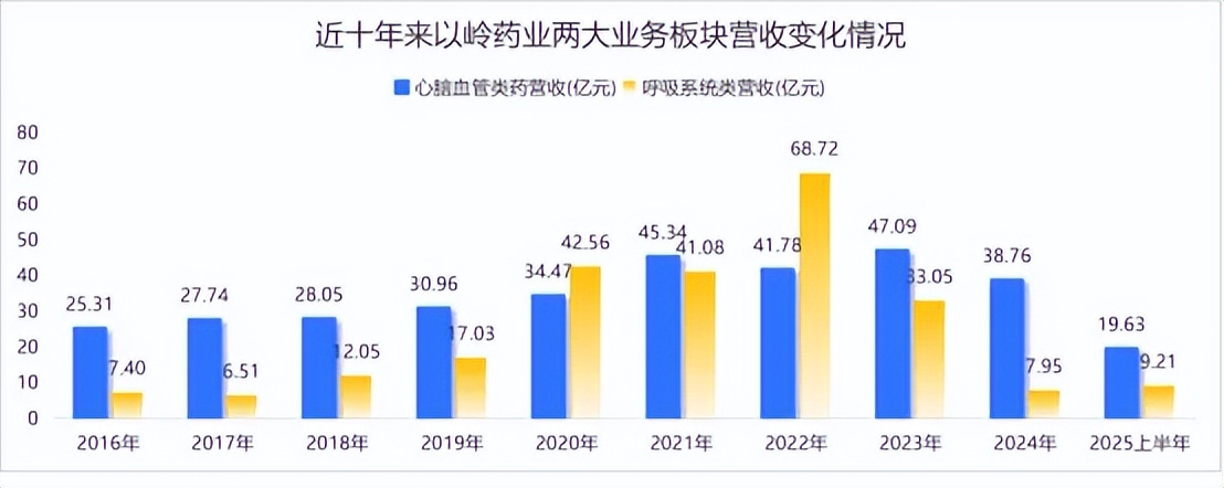 不仅呼吸系统类产品受挫,另一大板块——心脑血管类药品也已显现颓势,在2022年及2024年分别出现下滑。