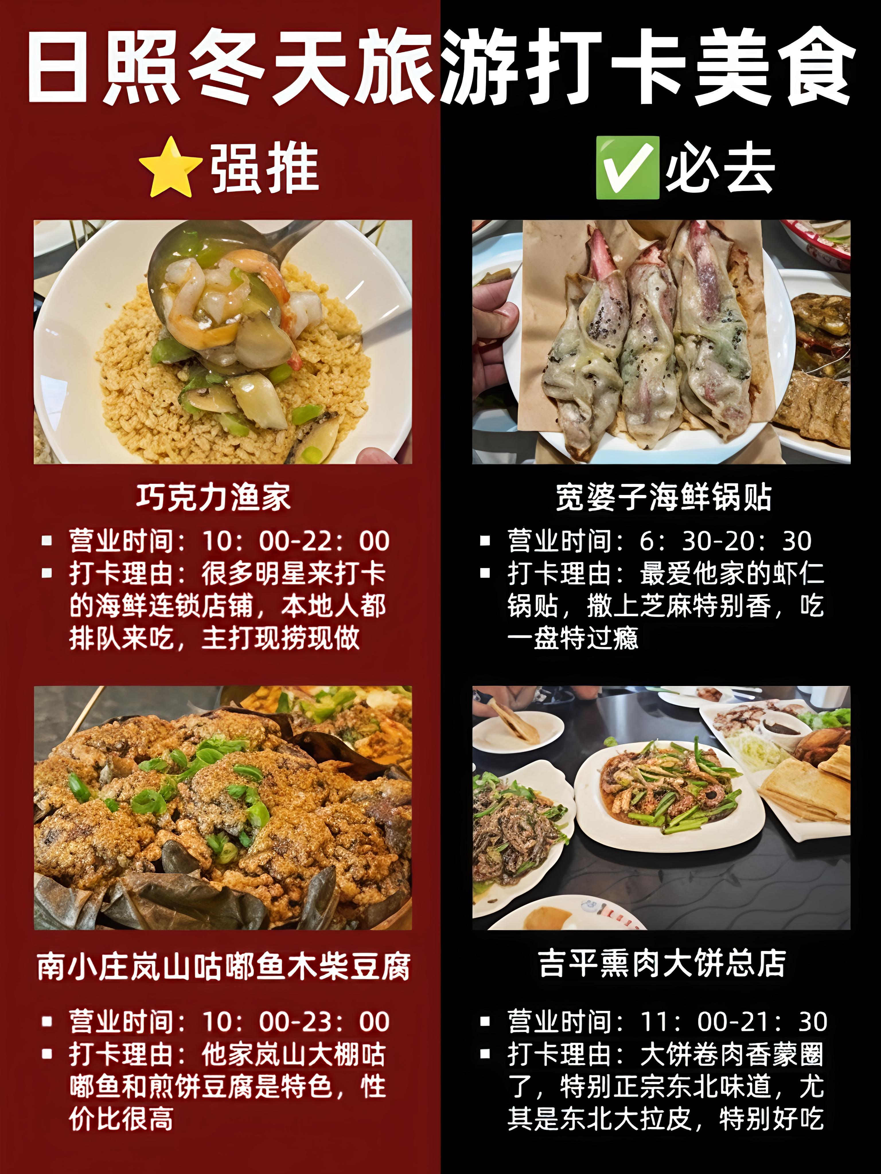 我们本地人常去吃的海鲜店铺是巧克力渔家,一般我们都错开饭点,因为好吃所以人多,大家吃蒸汽海鲜锅🦀!还有宽婆子海鲜锅贴🥟是我们常去的早餐店铺,现包现煎,特别香!南小庄岚山咕嘟鱼木柴豆腐家的大棚咕嘟鱼我每两周都要吃一次,这鱼肉🐟太嫩了
