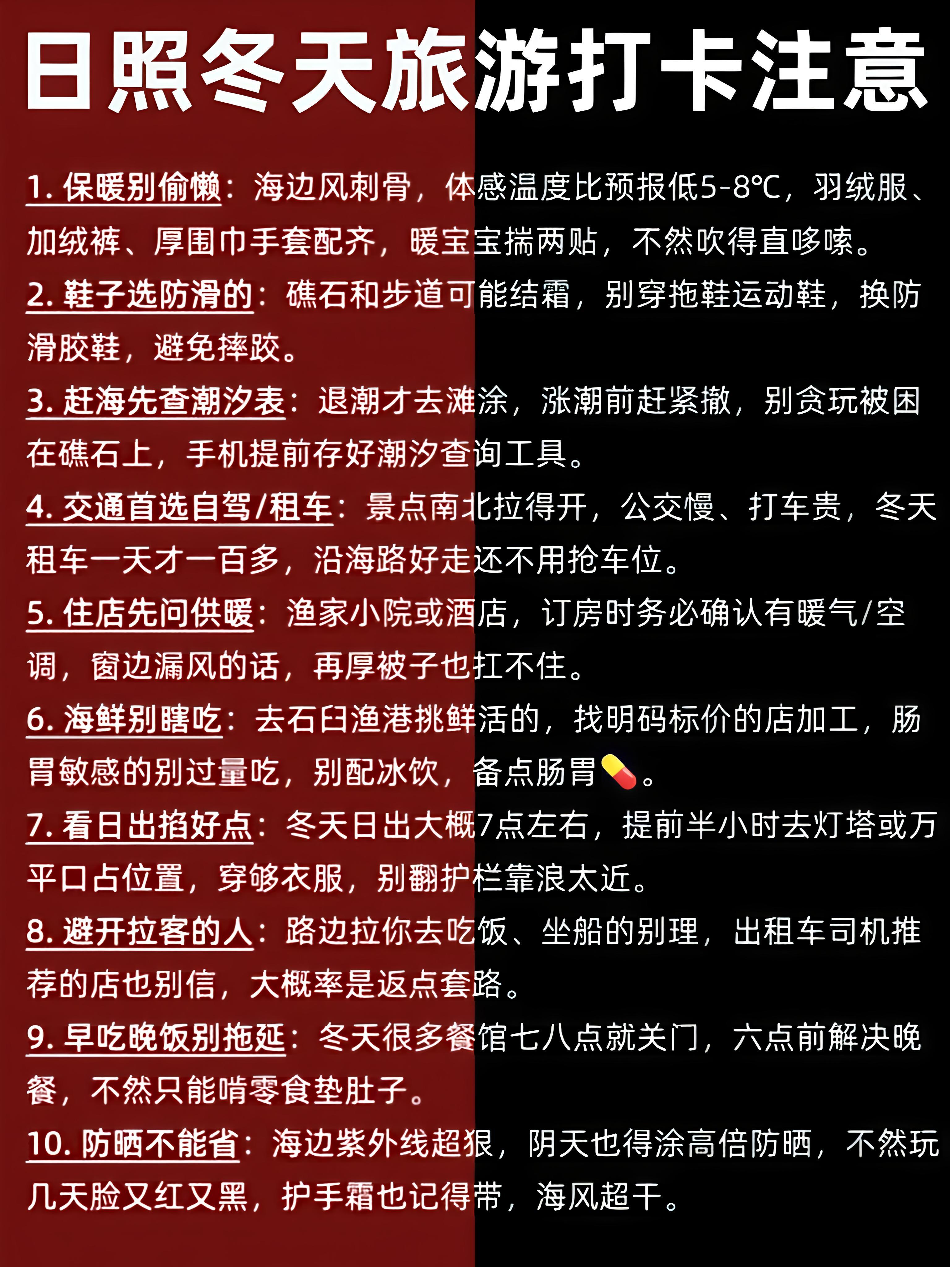 日照冬天虽然冷,但是真的好玩,下雪🌨️去万平口,山海天阳光海岸的海边打雪仗,堆雪人,还能听海浪声🌊,我们这边的小朋友都这么玩,去灯塔广场打卡✅,就不用我提醒了吧!租个车🚗玩还是很方便的。