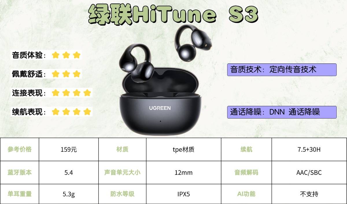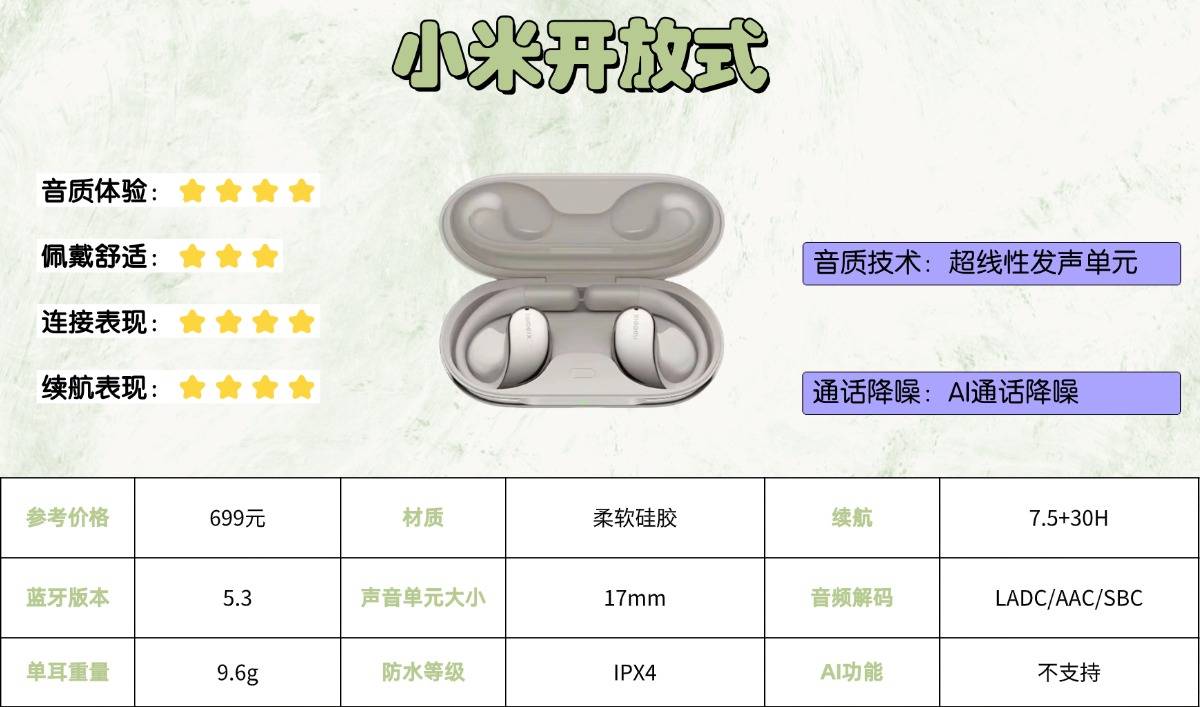 配置上,该耳机搭载蓝牙5.3芯片,连接快速且稳定;借助定向传声技术,有效减少漏音;配合双麦克风与AI降噪算法,保障通话语音清晰度。续航能力出色,单次可使用约10小时,搭配充电盒总续航接近40小时,满足全天候使用需求;同时支持IPX4级防水,足以应对日常汗液或微雨,整体功能配置均衡可靠。
