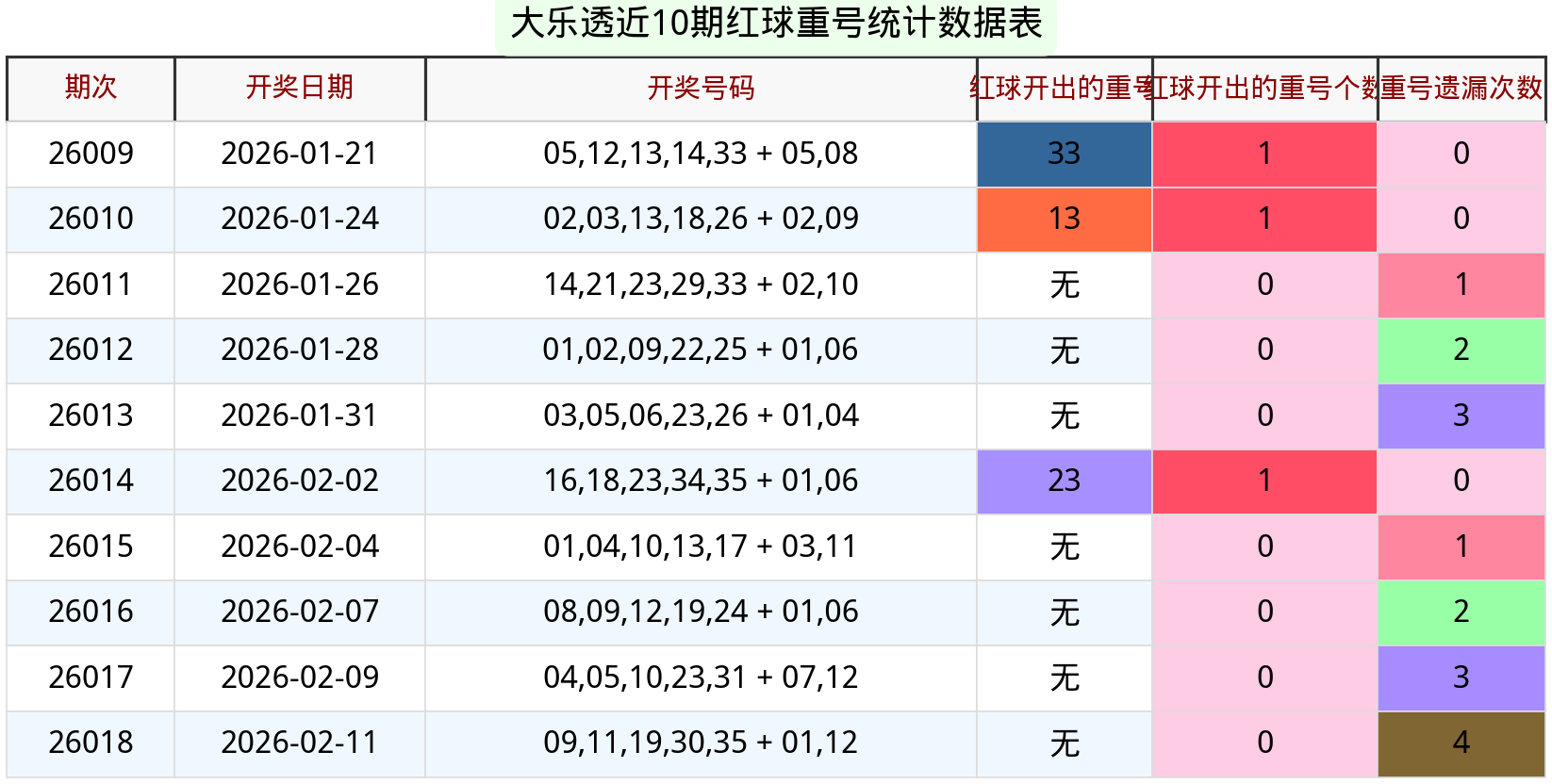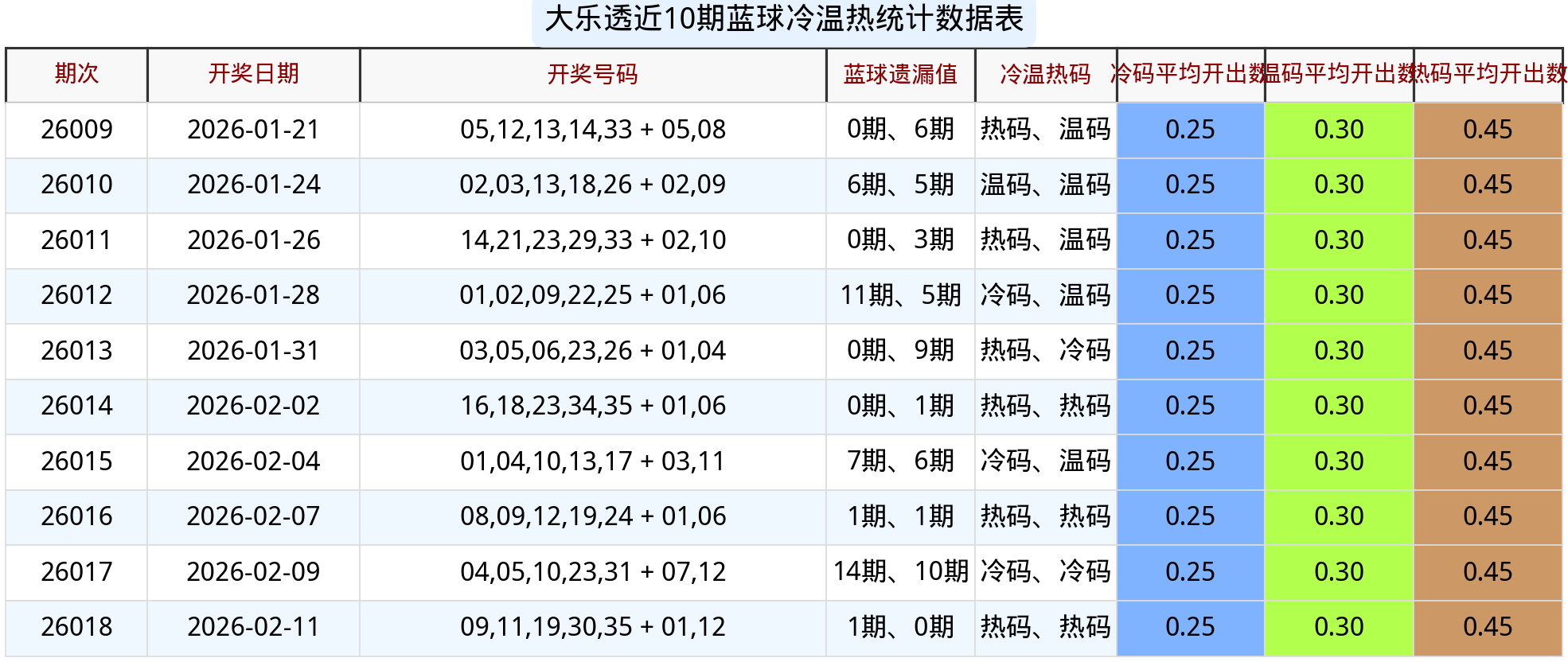 近10期蓝球热码出现6次(60%),但双热连开仅2次(26014、26016),而26017(07、12)、26018(01、12)已连续2期双热,突破历史极值