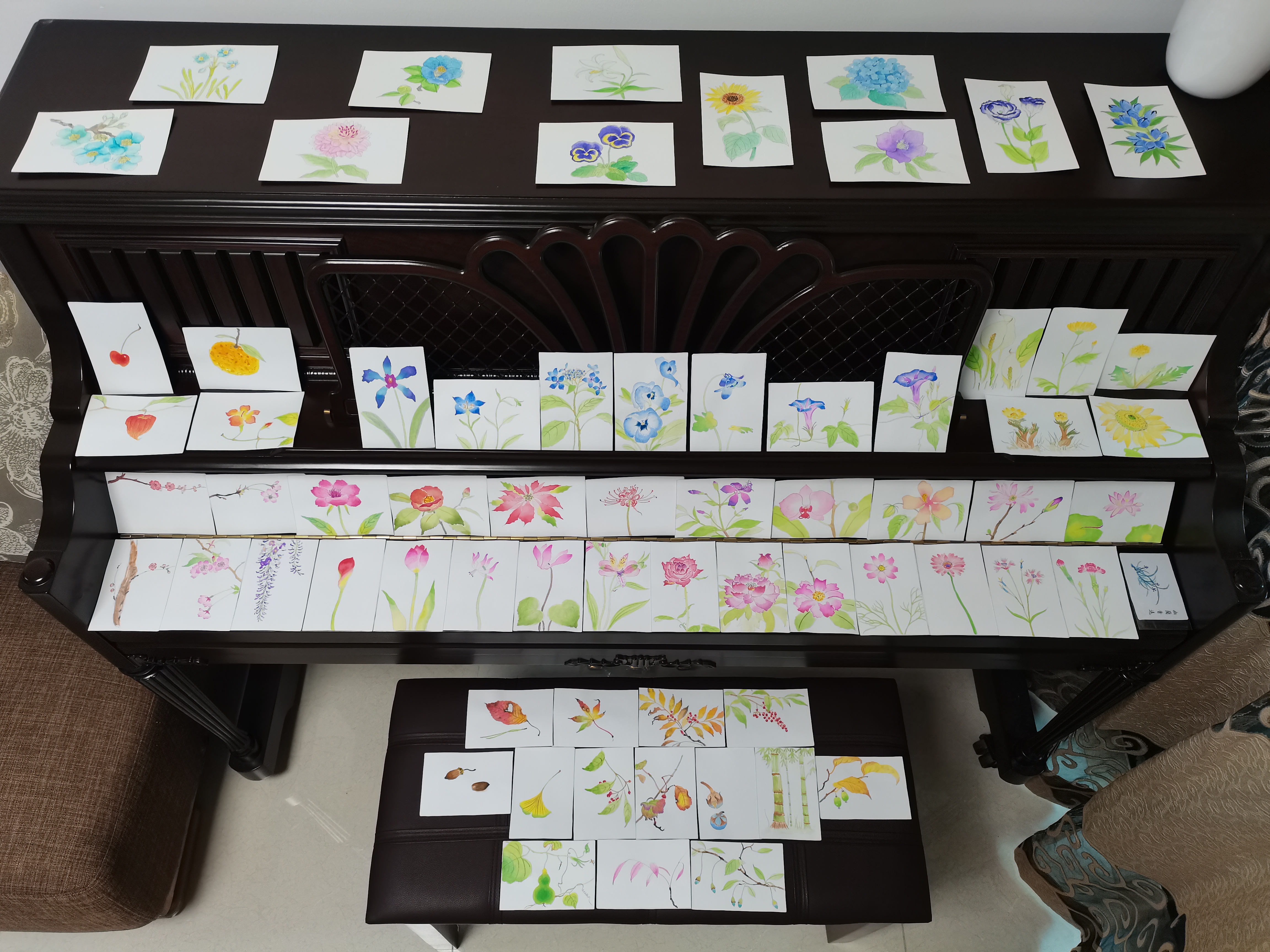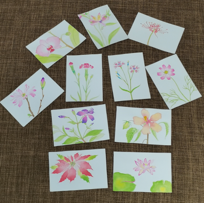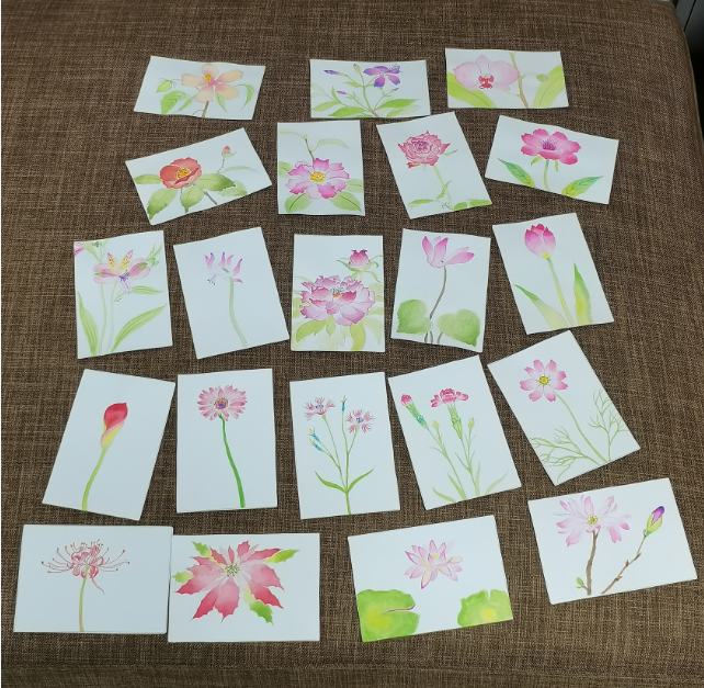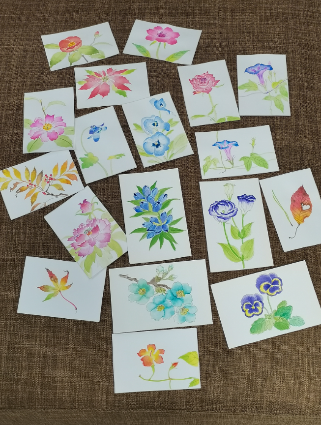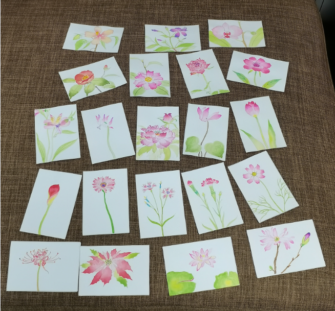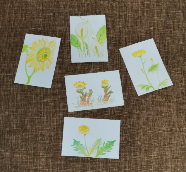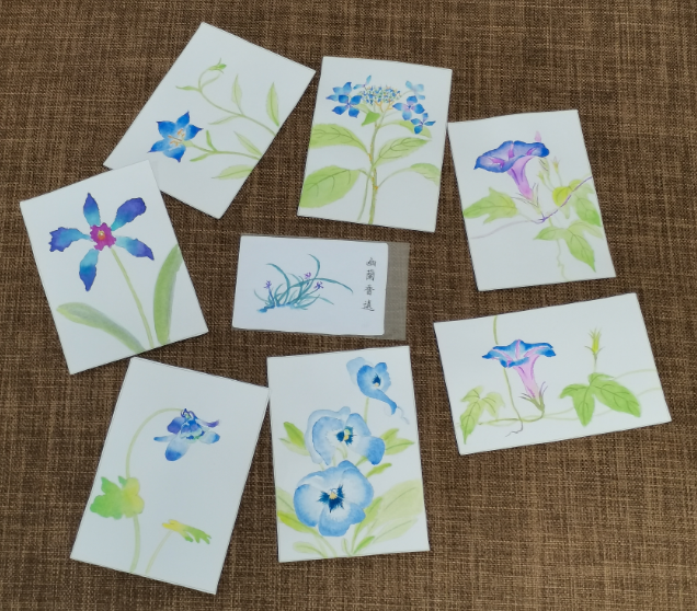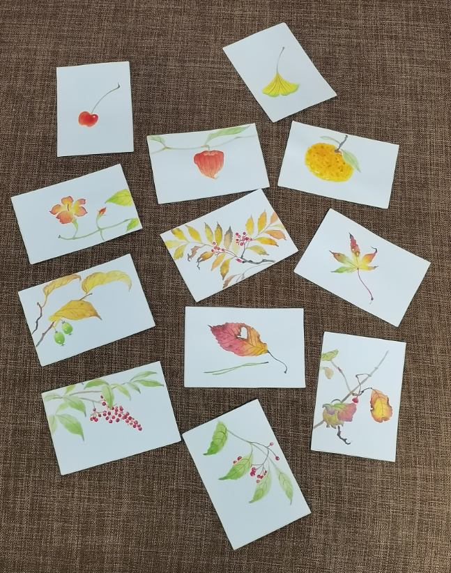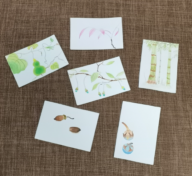 这一组水彩,纸张都很小。明信片的规格,差不多巴掌大,有的甚至要更小,和常用的磁卡差不多大。