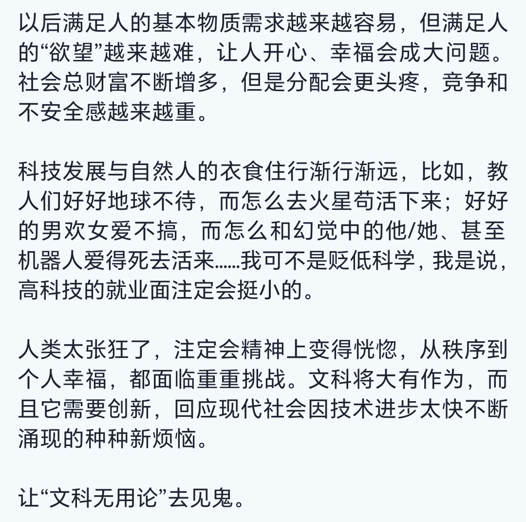老胡说了,理科生将来会逐步被AI取代,当人类物质越来越丰富,获取物质需求越来越简单之时,文科生的重要性将会凸显,因为文科研究的是人类精神层面的东西,精神需求才是终极目标。