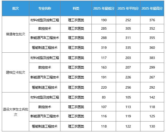 四川工程职业技术大学 2025 年四川省专升本分数线按科类划分,仅涵盖理工农医类一个类别,集中聚焦工科领域人才培养需求。专业共涉及 4 个热门工科专业。涵盖普通考生批次、建档立卡批次及退役大学生士兵批次三大专项批次,所有专业均在三个批次中同步招生。具体分数如下: