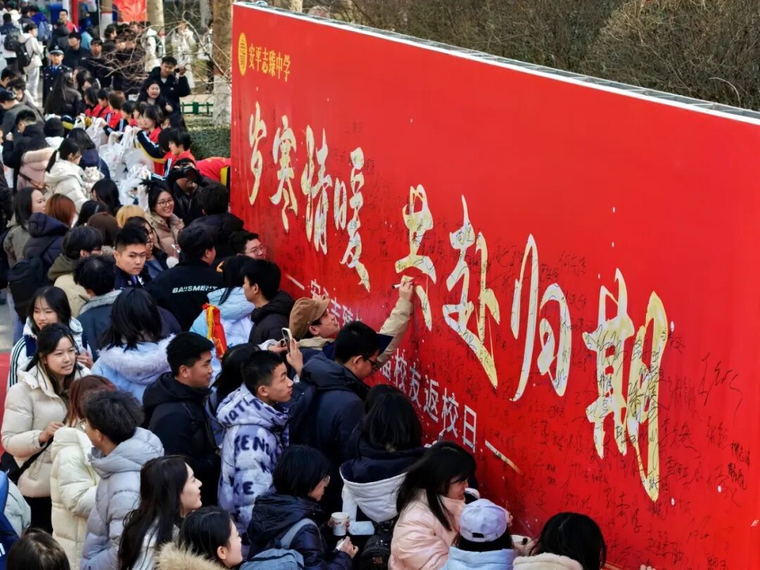 当熟悉的身影陆续出现,等待化为了笑容,思念变成了拥抱。一声“老师,我回来了”,一个紧紧的拥抱,胜过千言万语。他们给老师送上精心准备的礼物,接过学校定制的纪念品,在签名墙上郑重落笔——每一个名字,都是一段青春的印记。