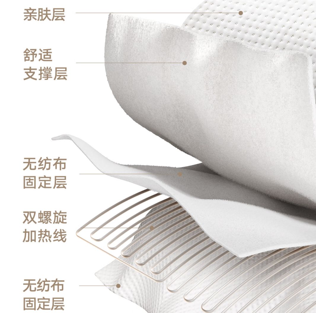 内部采用五层结构叠加设计,最外层是亲肤磨毛材质,摸上去柔软细腻,贴肤躺上去没有丝毫粗糙感,包裹感特别好;中间依次是支撑层、加热线夹层,上下用无纺布牢牢固定住双螺旋加热线,层层防护之下,既保证了毯子的蓬松度,又完全不会感觉到内部加热线硌身,孩子躺上去翻来覆去,也不会有异物感。