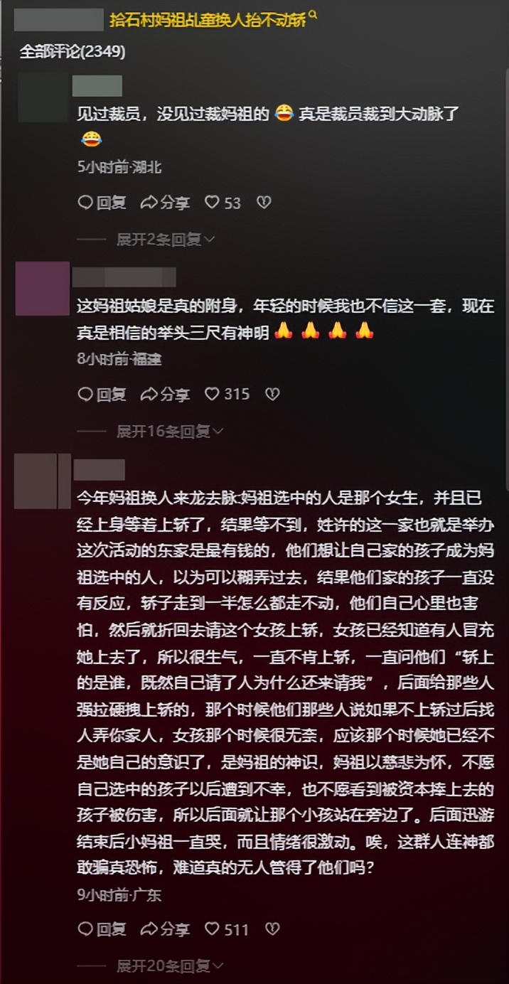 现场更是围满了村民,一时间游神活动被迫中断,主事人急得像热锅上的蚂蚁,最好只能去请真正的“小妈祖”。
