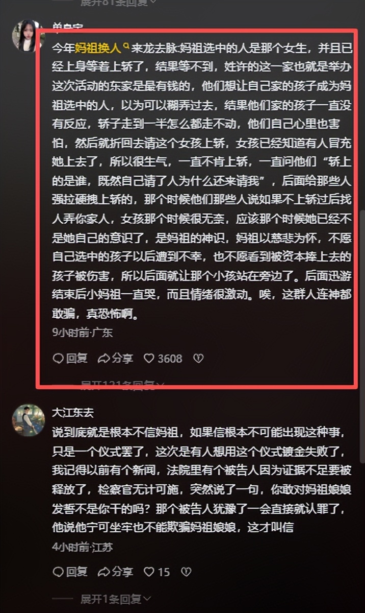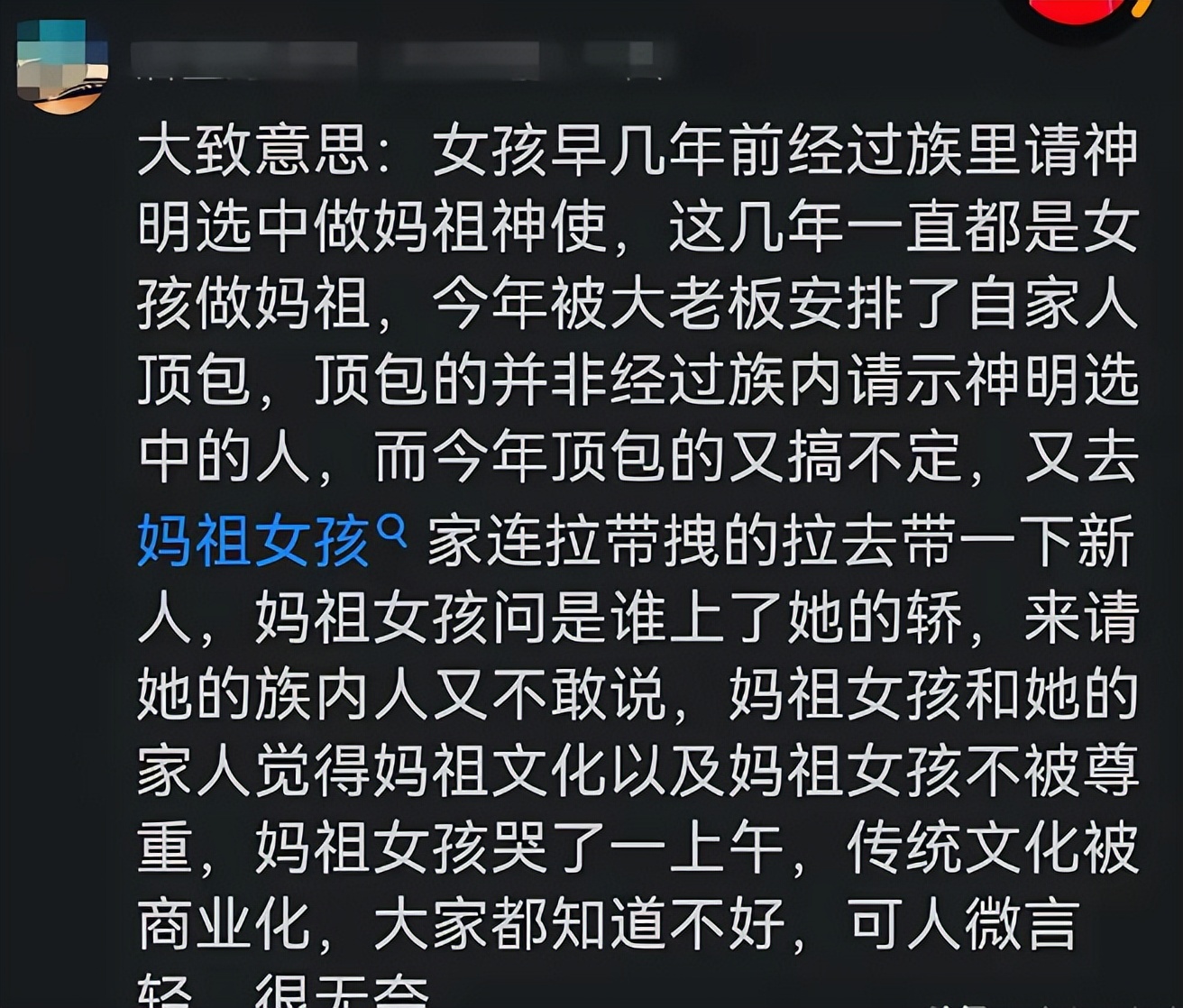 这几年来,每年游神都是她主持,动作娴熟、神态庄重,村民说“看到她就像看到妈祖显灵”,但就是这样一个被认可的小妈祖竟然直接被换了。
