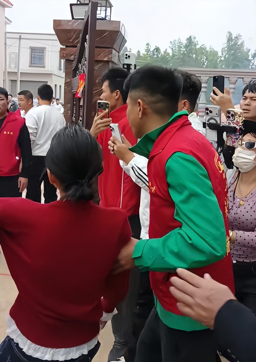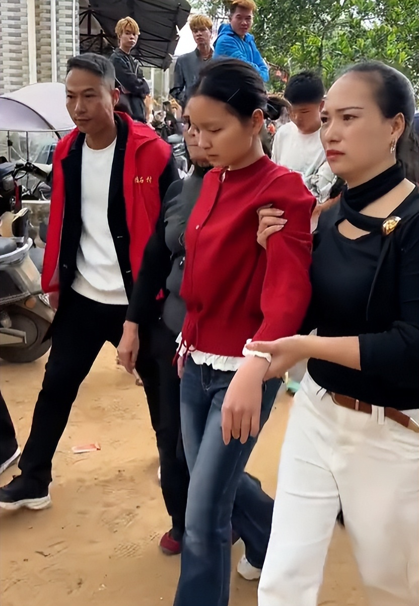 仪式结束后,女孩在家人的陪伴下往家走,整个人累得像散了架,被人扶着,又哭了,她妈妈全程脸色铁青,一句话没说。