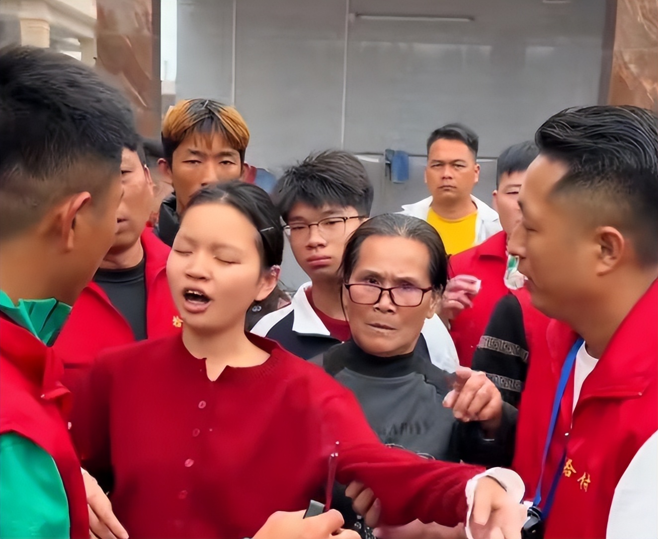 结果红马甲见请不动,直接上手拉人,另一个工作人员也凑过来,两人一人拽一只胳膊,想把女孩硬架走。