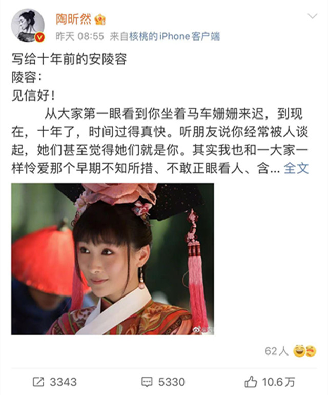 1.《甄嬛传》中每一个人物故事就是一个人生在《甄嬛传》播出十周年之际,演员陶昕然在网上发文:“十年了,时间过得真快,其实我和大家一样怜爱那个早期不知所措、楚楚可怜的你,那时候的你由衷地感谢甄姐姐的出手相助。”
