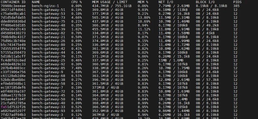 展示各容器CPU、内存、网络I/O等资源使用情况,所有容器均正常运行