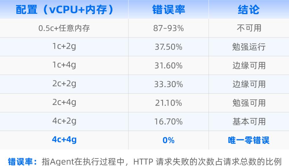 测试表明,OpenClaw在低核环境下错误率显著上升,而达到企业级配置后,系统可实现7×24小时稳定运行,内存增长可控,复杂工具调用场景下未出现崩溃。