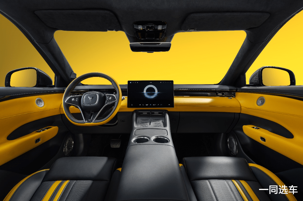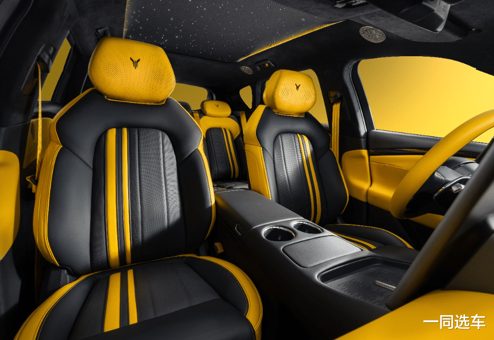 车内同样采用黑黄撞色搭配,仪表台、门板、方向盘、座椅等位置均应用了黄色超纤材质包覆,A/B/C柱和顶篷则使用了仿麂皮材质。车内座椅黑色部分使用了NAPPA真皮材质包覆,还可以选装星空顶,具有12大定制模式、14种可分区的星空色彩。