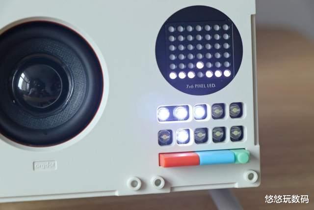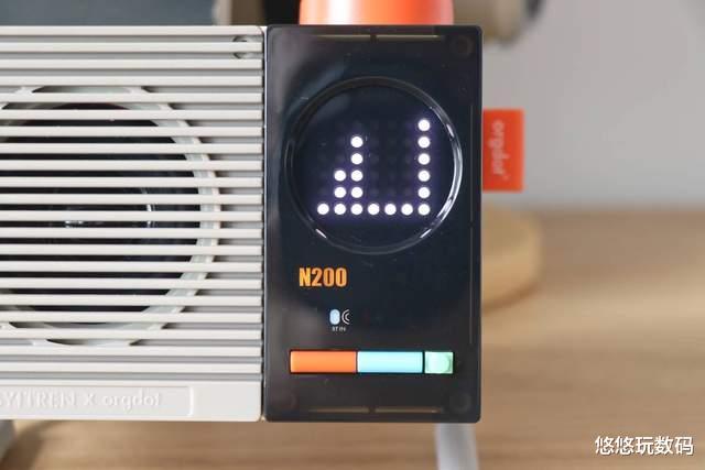 赛塔林N200的机身正面为喇叭、圆形点阵显示屏和10颗LED灯珠,以及桔色、蓝色和绿色按键,这种主流多色搭配方式让整个机身看起来更有活力,符合年轻人的审美。同时在机身正面预留了8个圆柱形固定柱,方便可拆卸模块的更换。