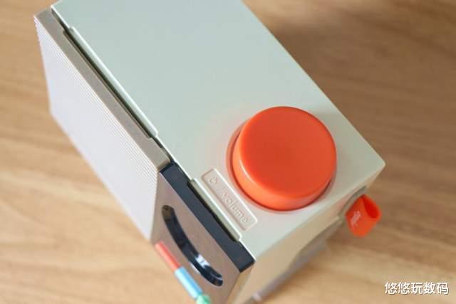 机身顶部的凹面圆形桔色机械旋钮绝对是该音响的点睛之笔,进一步提升了视觉层次感,该旋钮既能通过按压来开关机,而且可旋转调节音量。