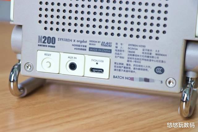 赛塔林N200桌面音响内置了1800mA锂电池,满电可持续使用4小时,偶尔带出去露营也没问题,带个充电宝就能实现持续供电了。