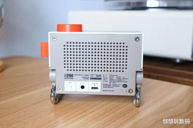 赛塔林N200桌面音响采用复古工业风设计,长方体小巧机身尺寸132*108*74mm,机身外壳使用了ABS+PC复合材质,这种轻量化设计使得机身重量只有489g,相当于一部智能手机的重量,外出露营携带也很便携。外壳表面有淡淡的磨砂质感搭配桔色机械旋钮进一步提升了复古感。