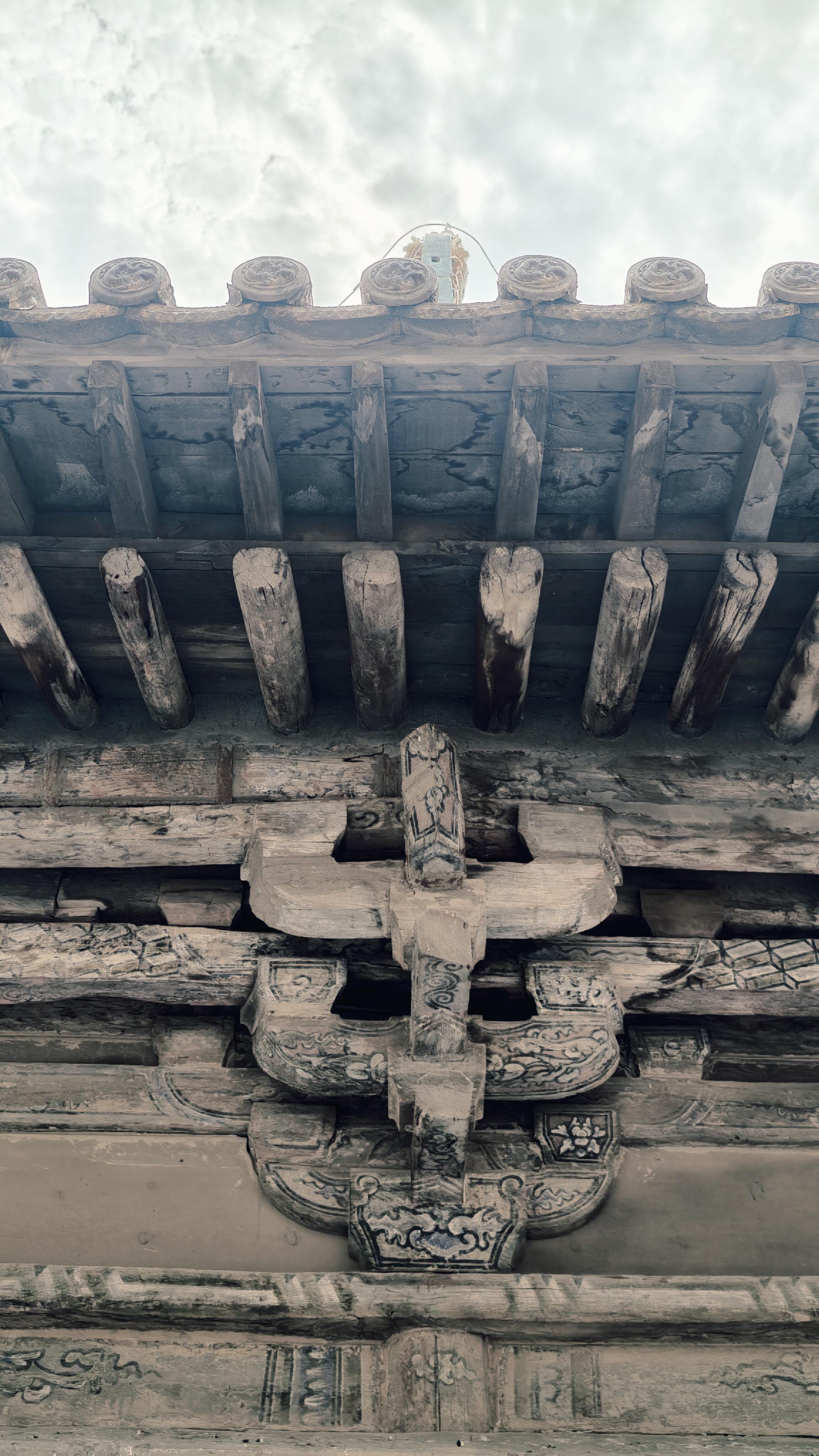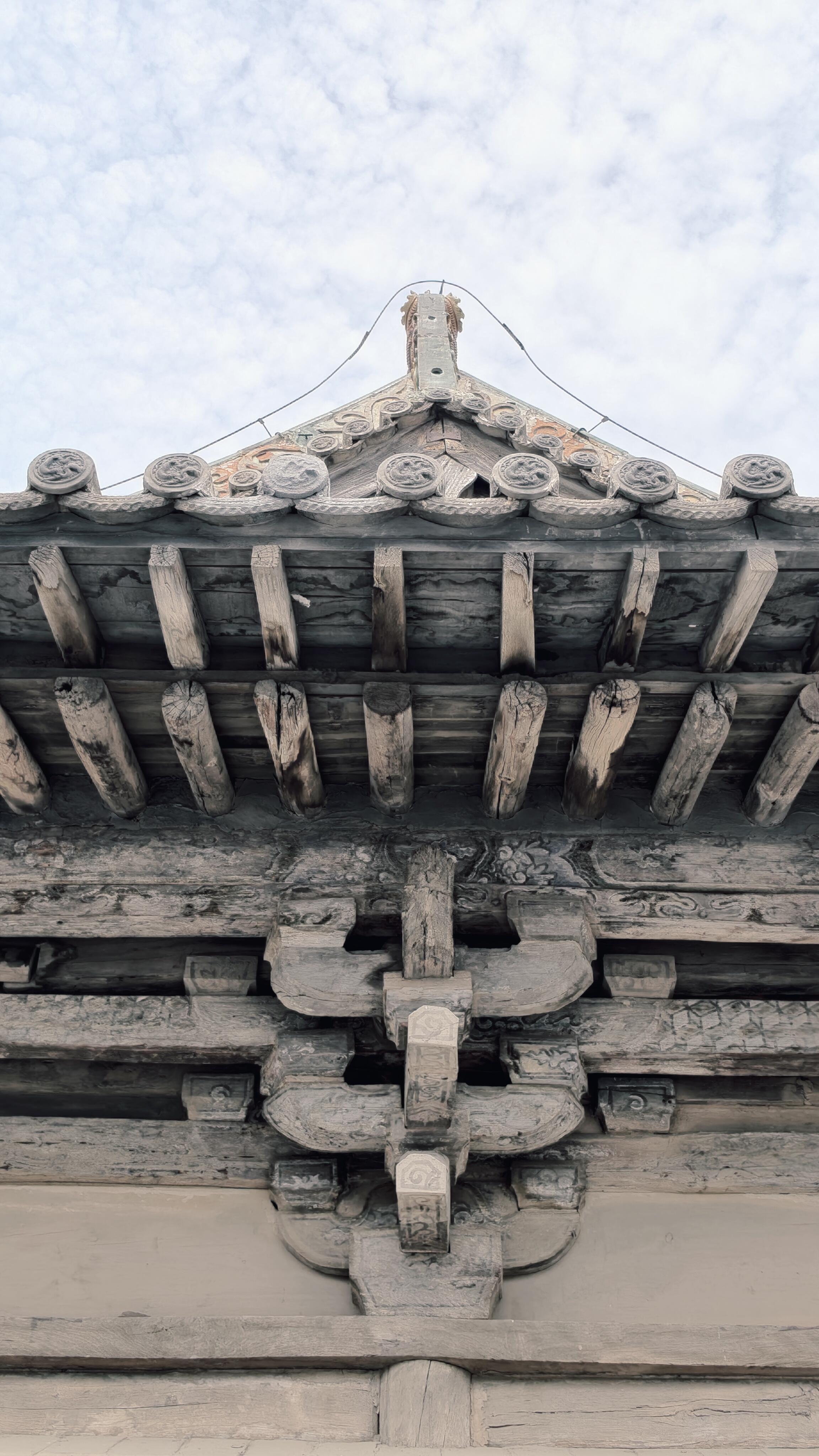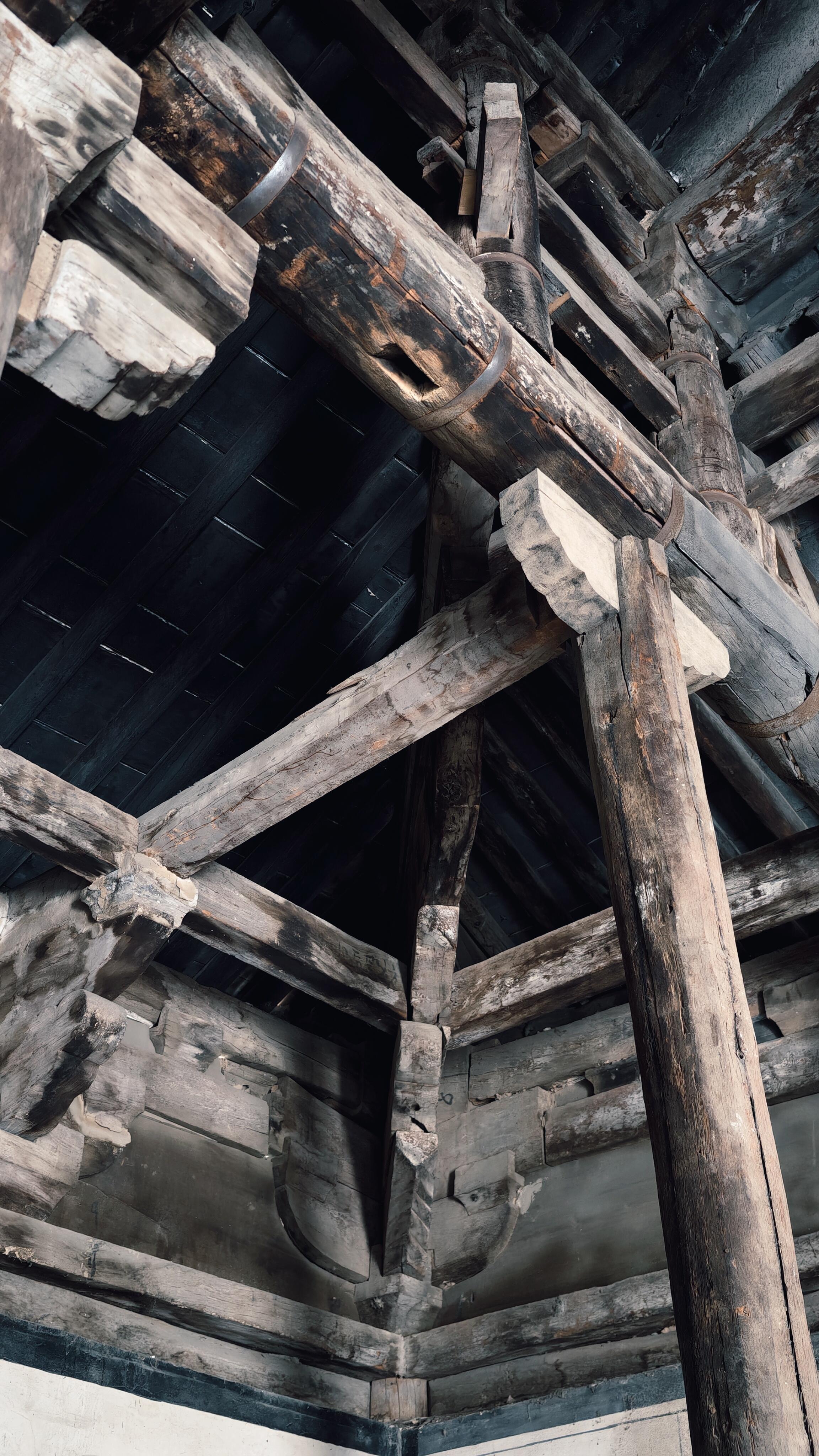 守在村里的老人说,他从小就看着这座佛头寺长大,听祖辈讲,以前寺里不止这一座过殿,还有山门、正殿、配殿,只是后来渐渐损毁,只剩这座金代过殿留存下来。“以前逢年过节,村里人会来这儿上香,殿里还摆着佛像,后来佛像没了,就剩这梁架了。”老人指着梁枋上一处模糊的印记说,那是早年村民为了保护梁架,用布条缠过的痕迹,“那时候有人想拆了木料盖房子,是老人们拼死护住的,说这是老祖宗留下的宝贝,不能毁。”现在想来,幸好有那些老人的守护,我们才能在今天,还能看到这座金代木构的原汁原味,还能透过梁架,触摸到千年前的历史温度。
