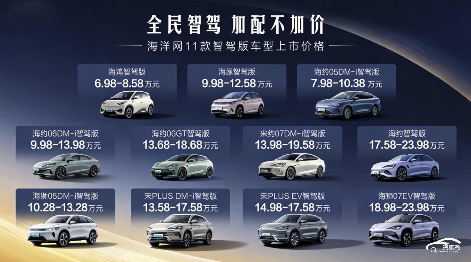 值得一提的是,比亚迪的智驾版新车型“加配不加价”,与此前车型价格相同。其中,首款搭载高阶智驾的小型车海鸥,仅需6.98万元就能体验。