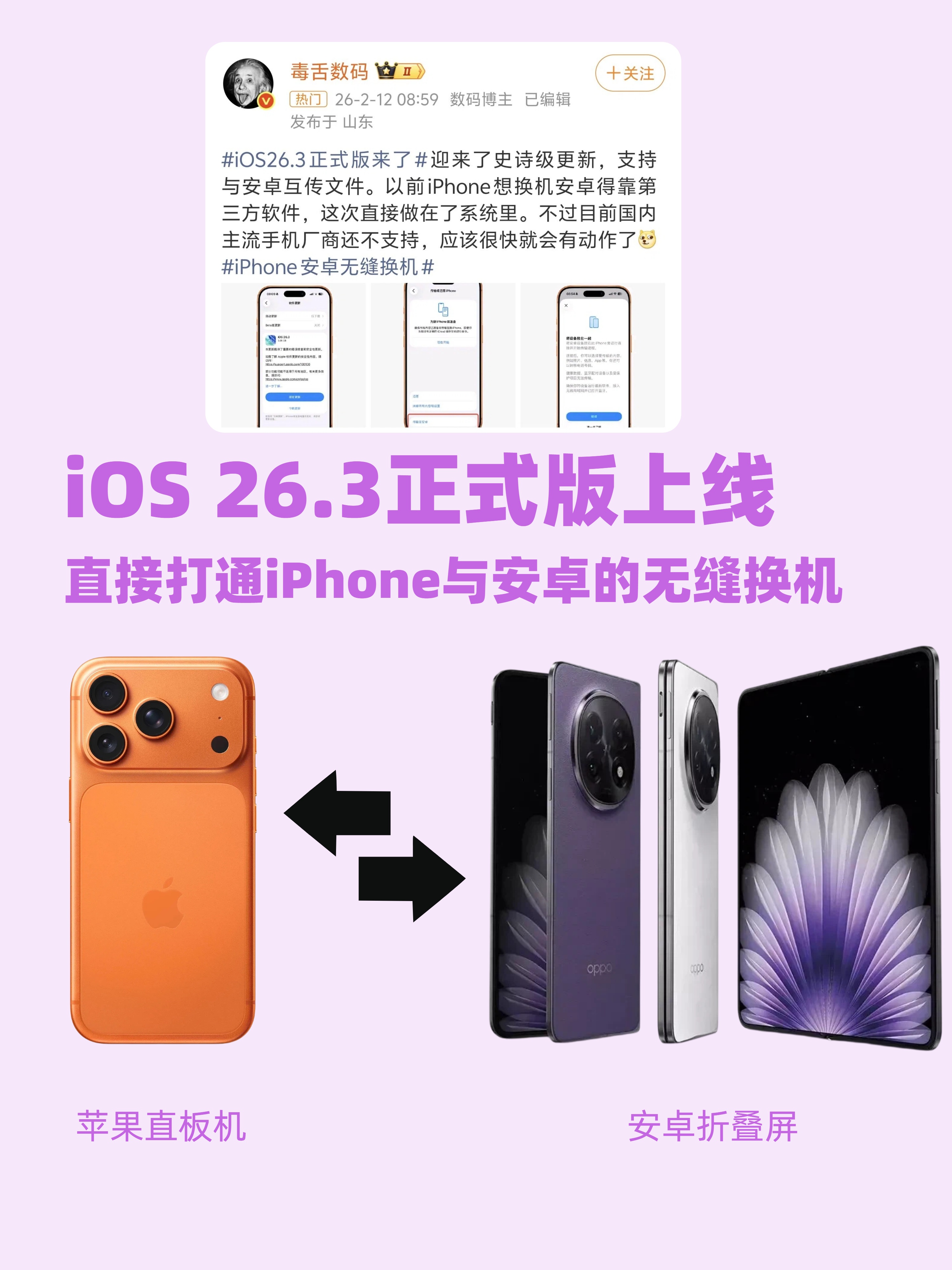 iOS 26.3来了,这次绝对是苹果系统的史诗级更新!!尤其推荐双持党速速升级,以前iPhone想换机安卓得靠第三方软件,这次iOS 26.3直接做在了系统里,支持与安卓互传文件,方便程度提升了不止一个level!