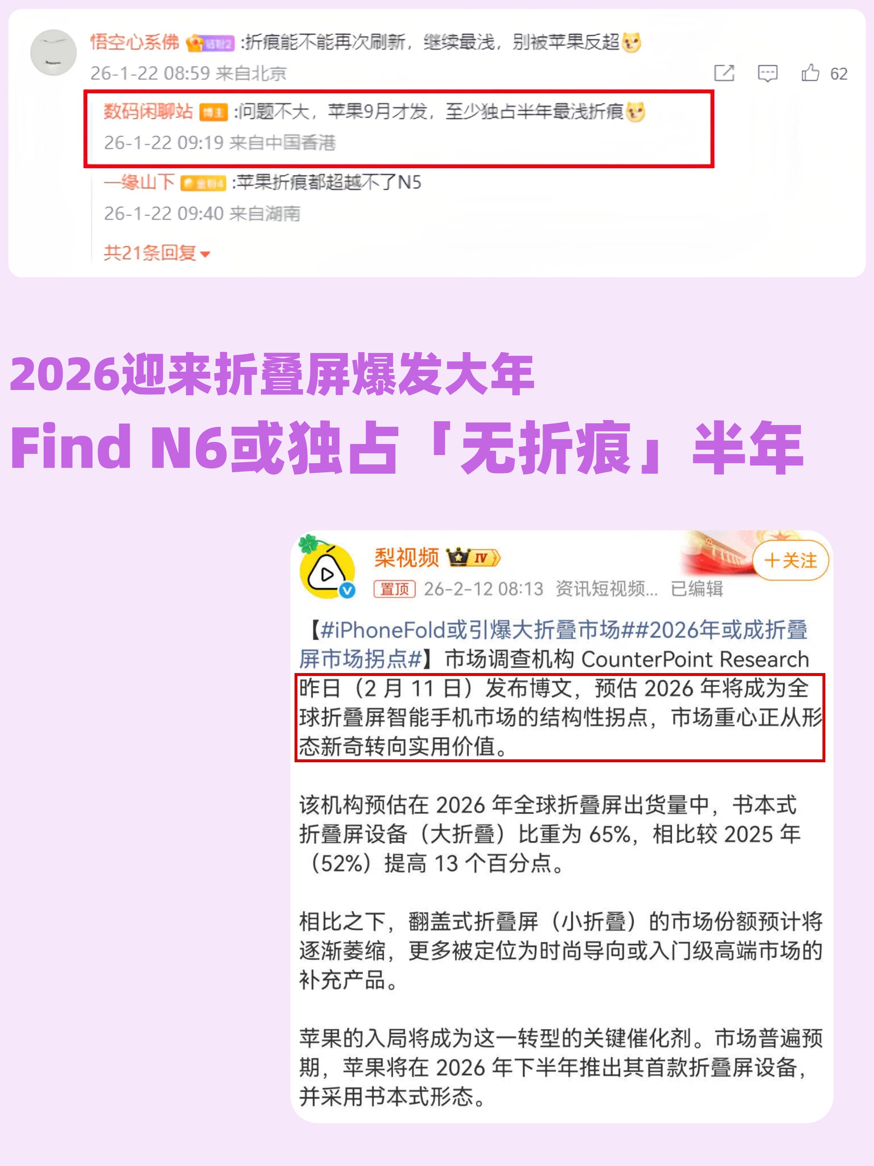 总之呢,现在想买折叠屏的朋友真的劝你别急。2026年折叠屏大年一开年就有硬货,等一手全球首款无折痕的OPPO Find N6,或者忍到下半年看iPhone Fold到底香不香。现在冲老款,大概率血亏。
