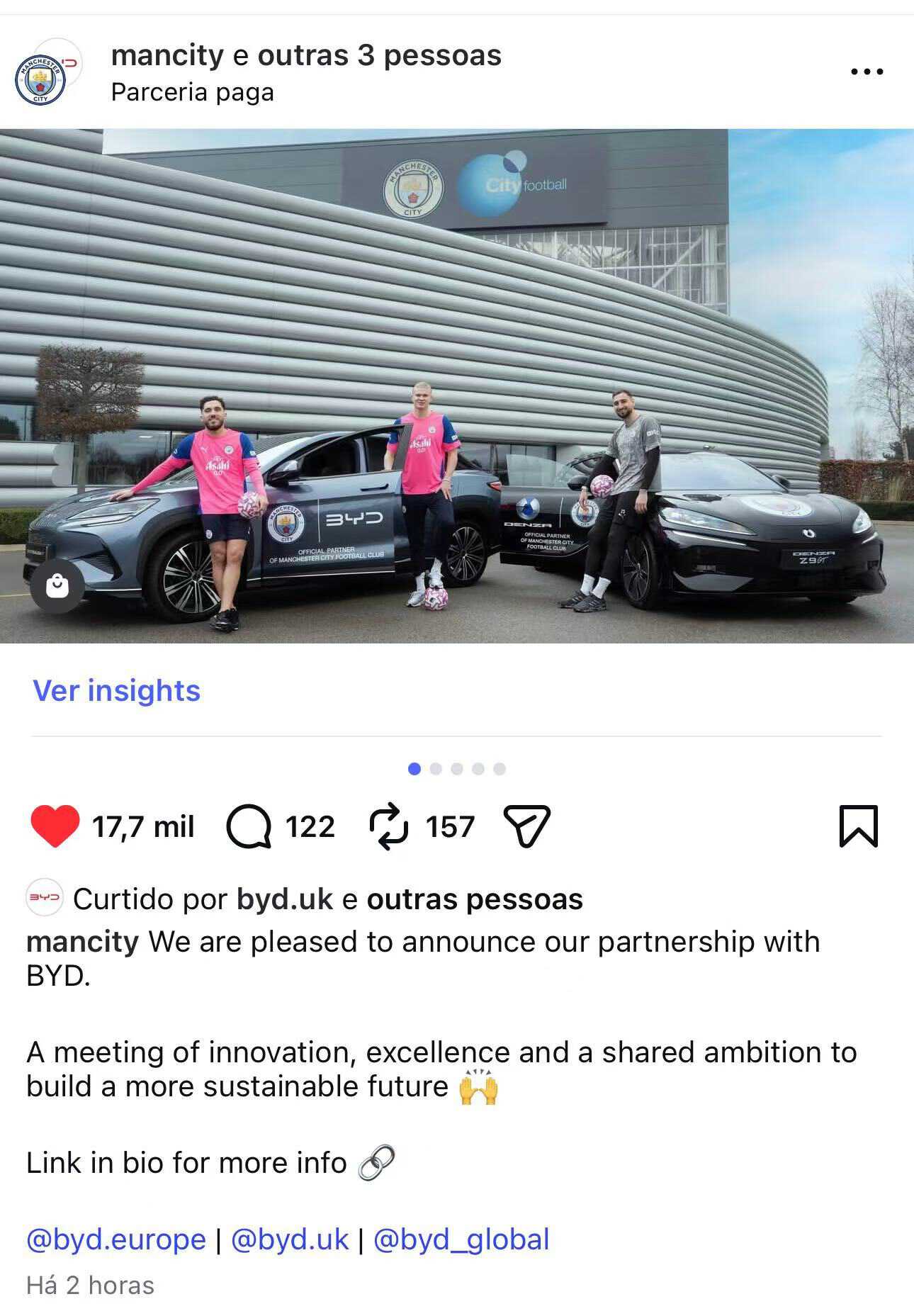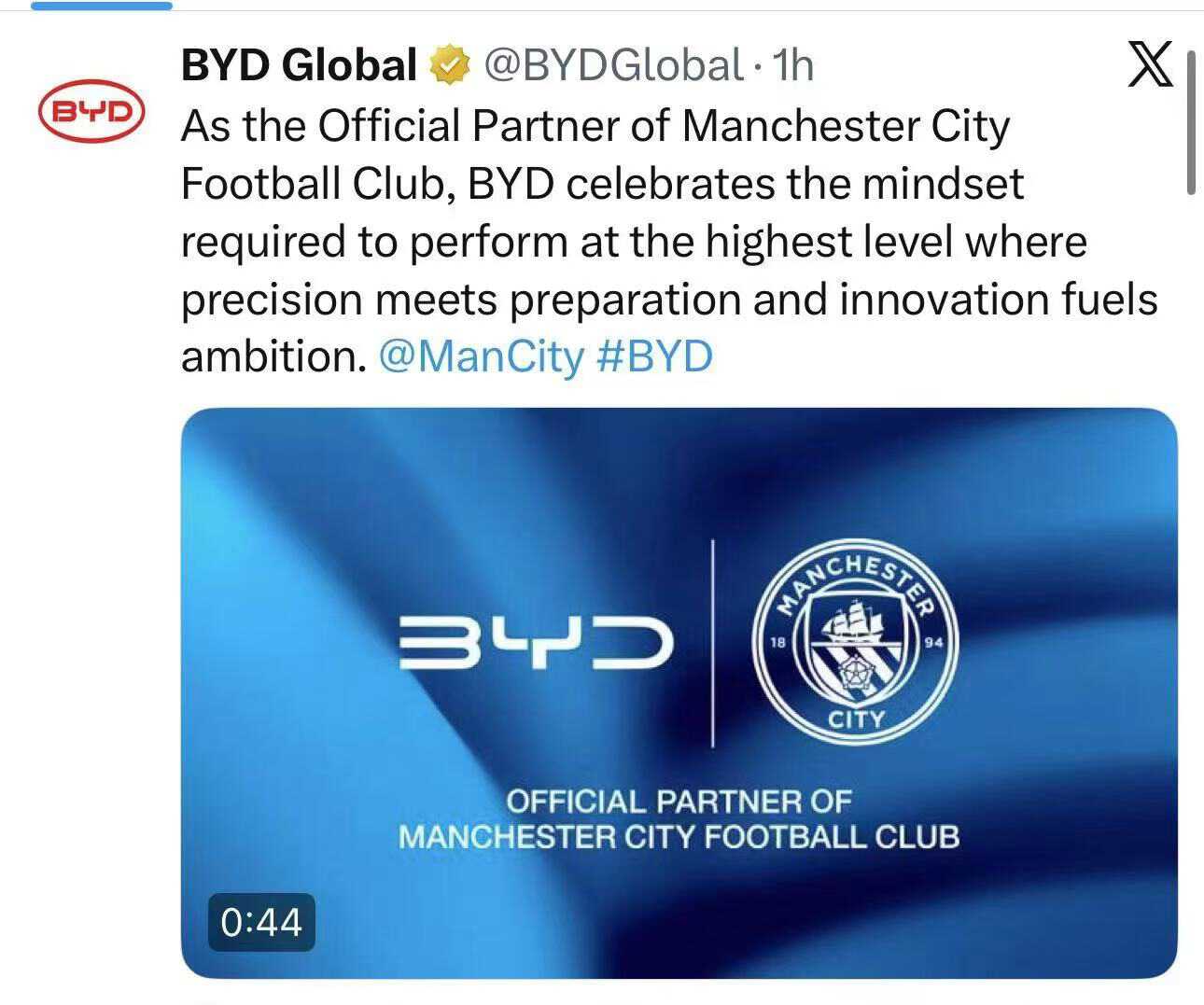 绿色出行赋能绿茵赛场!比亚迪正式成为曼城足球俱乐部官方合作伙伴!全球新能源汽车领军品牌携手世界顶级足球豪门,以绿色出行赋能绿茵赛场,用创新科技连接全球热爱。