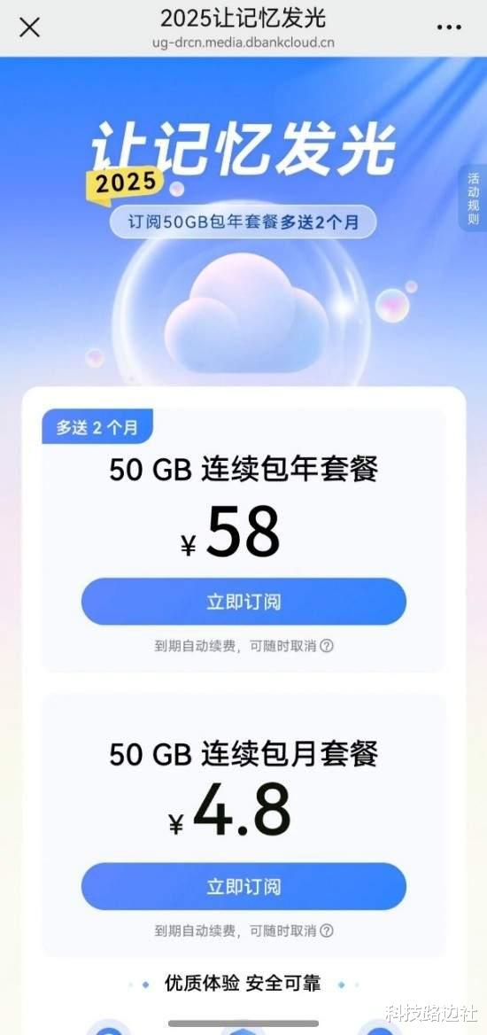 而且,年底了,华为云空间还带来贴心活动,现在订阅50G连续包年套餐,仅需58元/年,还额外赠送2个月时长!承包你一整年的安心存储,快去给你的2025年独家记忆,找个最稳妥的归宿吧!